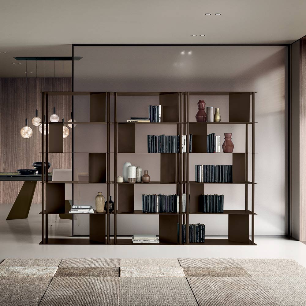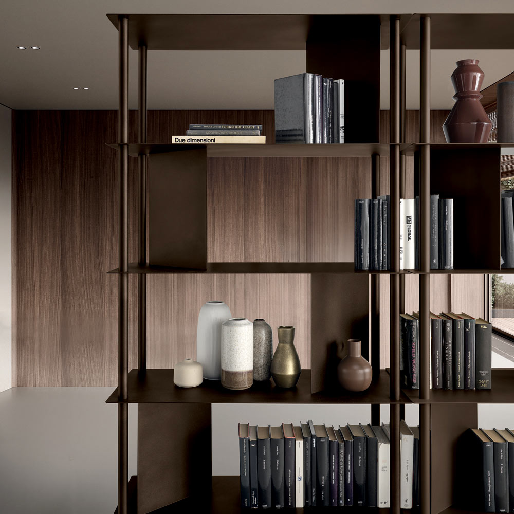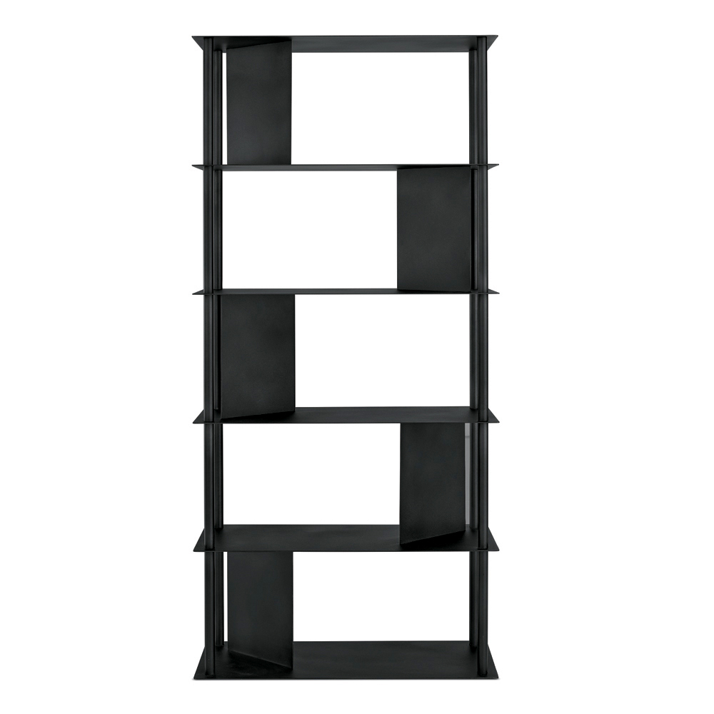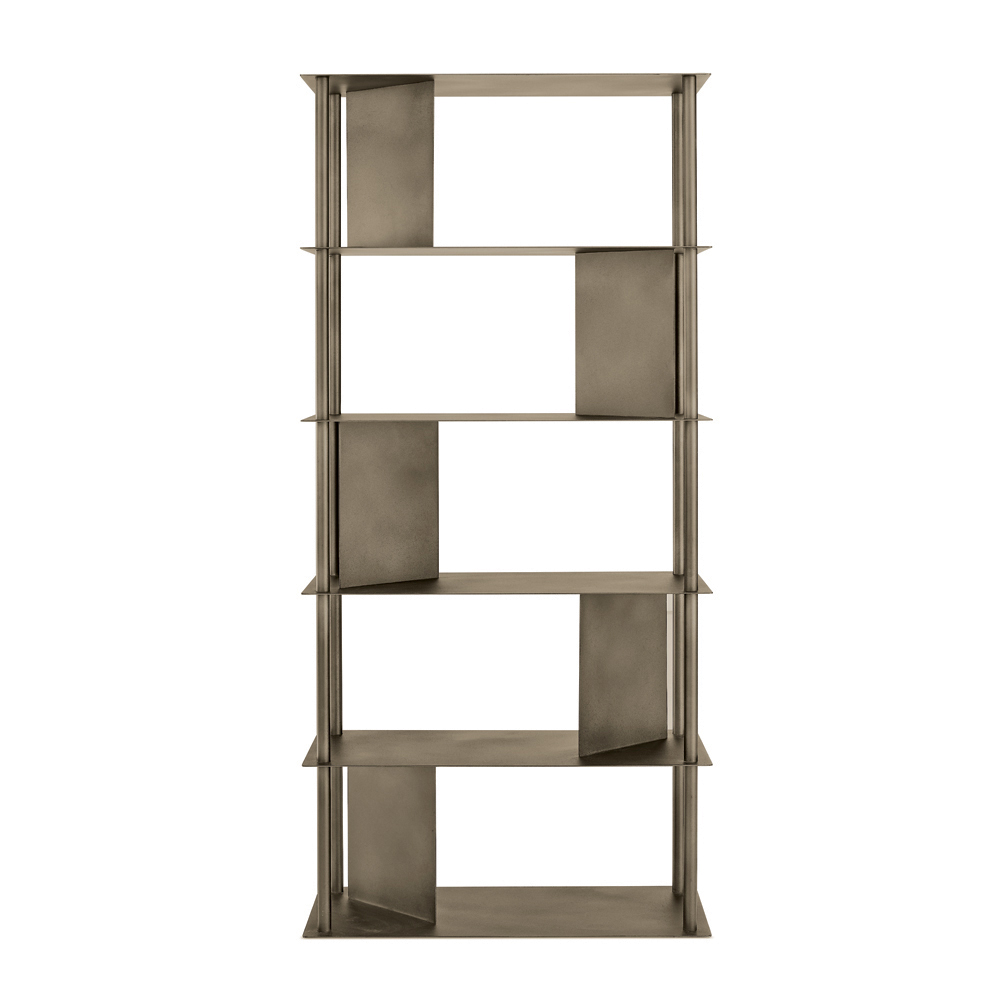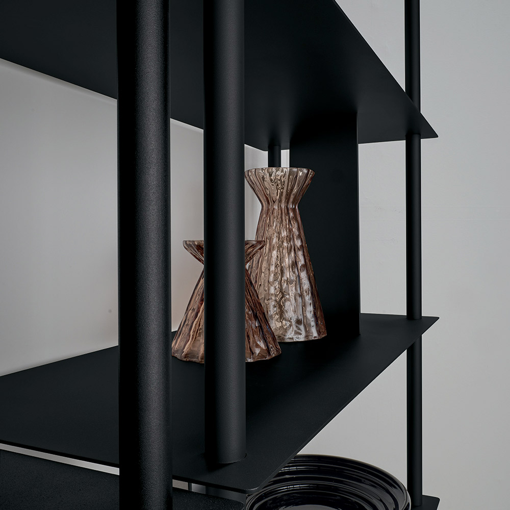 De boekenkast is vervaardigd uit geverfd metaal en bestaat uit vier verticale buizen aan de buitenkant die de planken ondersteunen, afgewisseld met schuine platen die de ruimte afbakenen en dienen als steunpunten voor boeken en objecten. Deze constructie creëert een verfijnd samenspel van massieve en open vormen, wat dynamiek en diepte aan het geheel verleent.