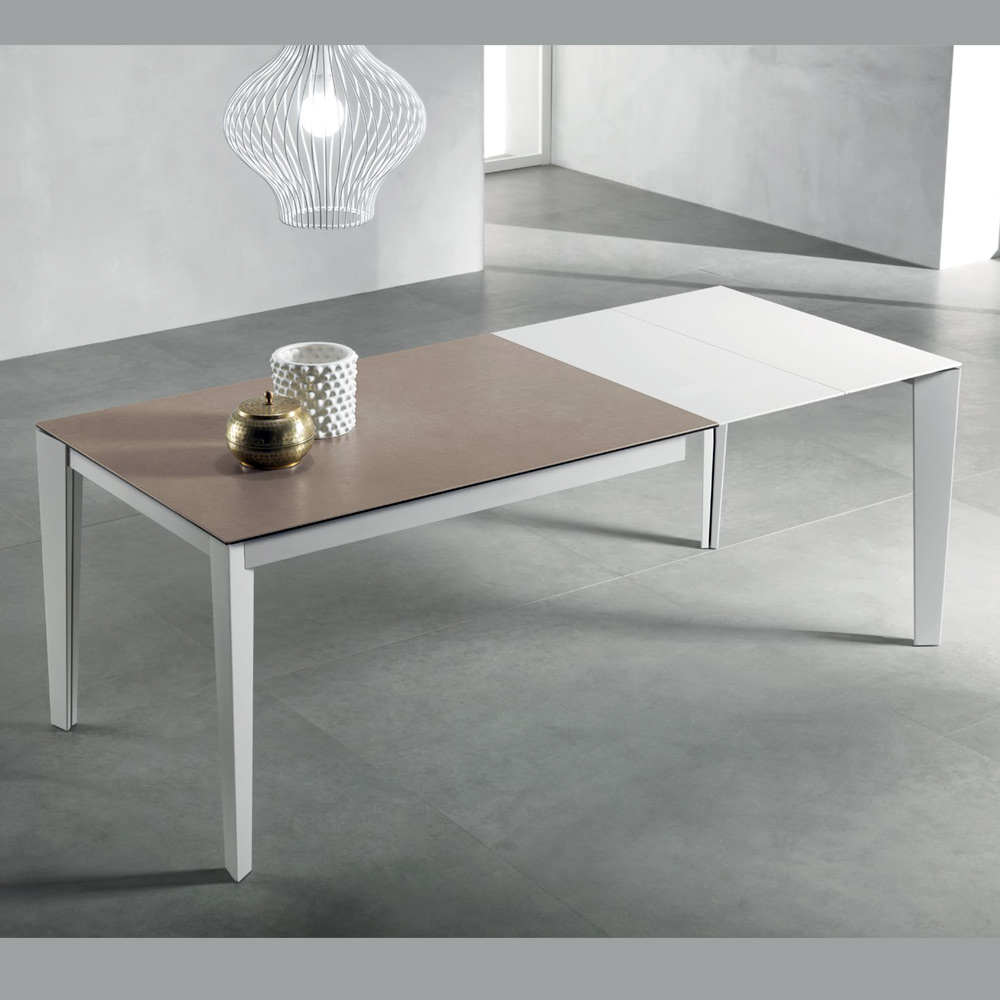 Deze elegante en functionele, uitschuifbare rechthoekige tafel combineert modern design met functionaliteit. Het 10/11 mm dikke glaskeramische blad met een Fokos Terra-afwerking , terwijl de matwit gelakte metalen poten stabiliteit en een eigentijdse touch toevoegen.