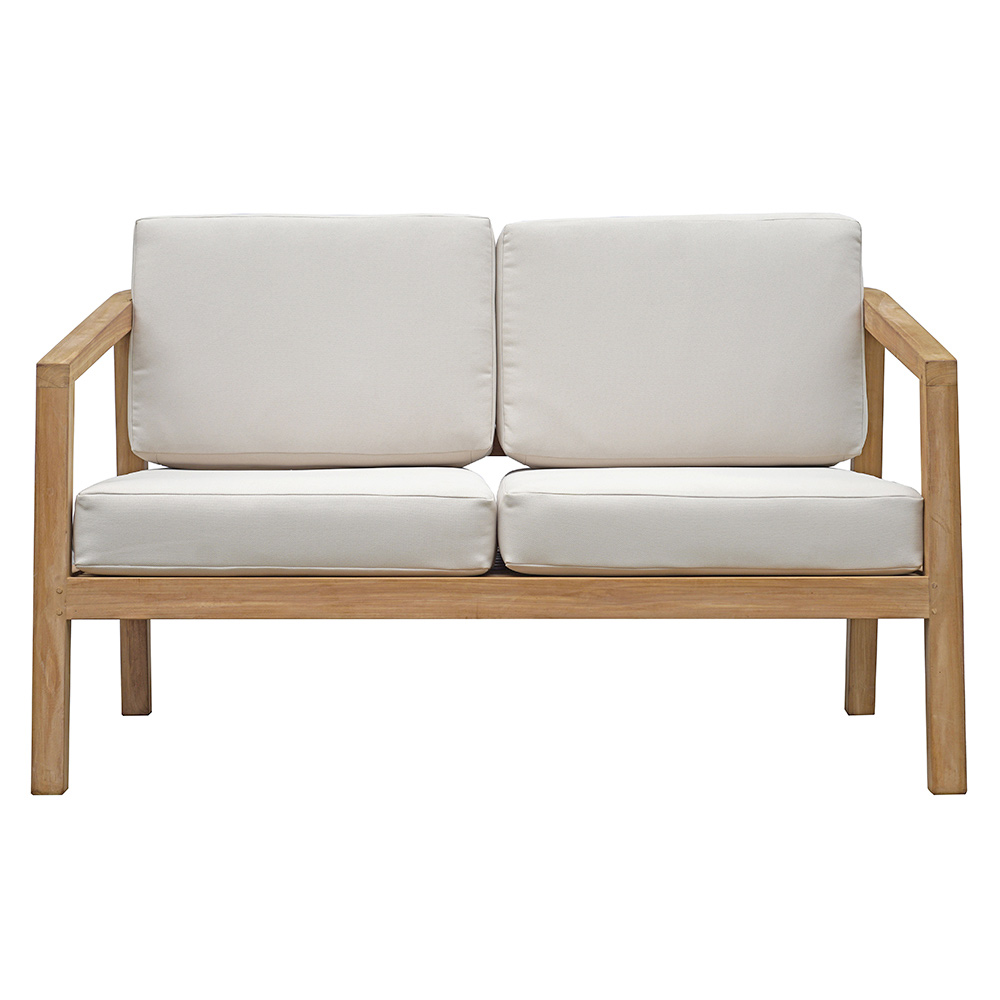 Het essentiële en harmonieuze ontwerp accentueert de textuur van het hout, terwijl de grote en comfortabele zittingen in ecrukleurige stof deze set ideaal maken voor momenten van pure ontspanning in de buitenlucht.