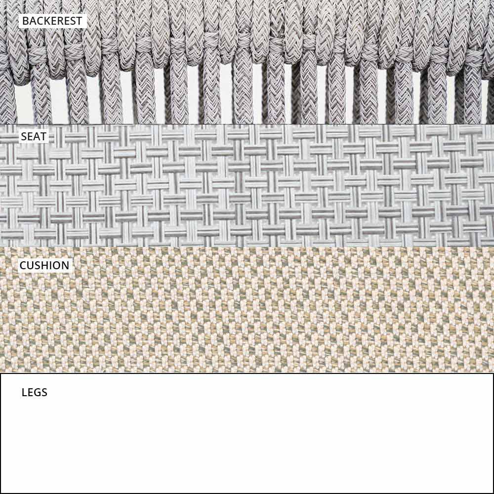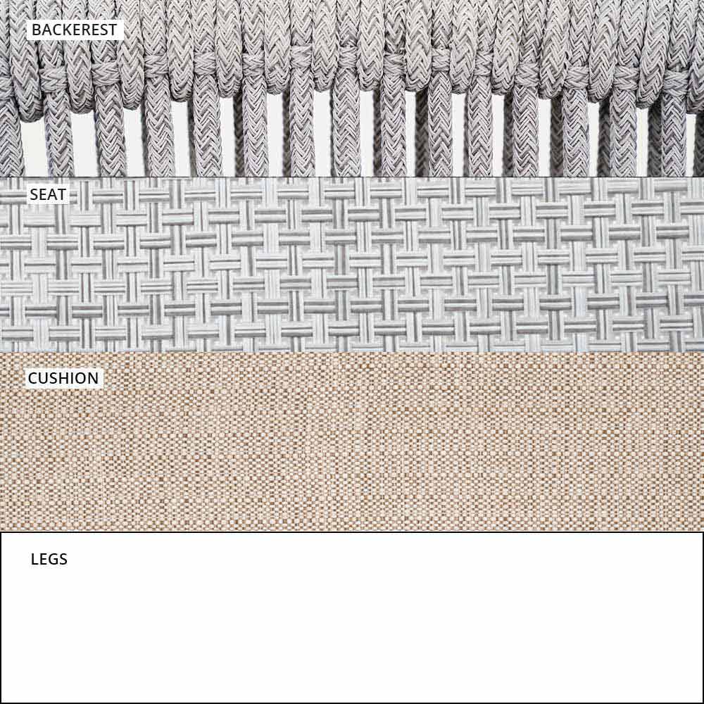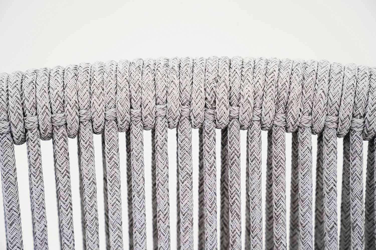 De omhullende welving van de rugleuning en de slanke lijn van de benen tekenen een elegant silhouet, versterkt door een harmonieuze verweving in synthetisch touw.