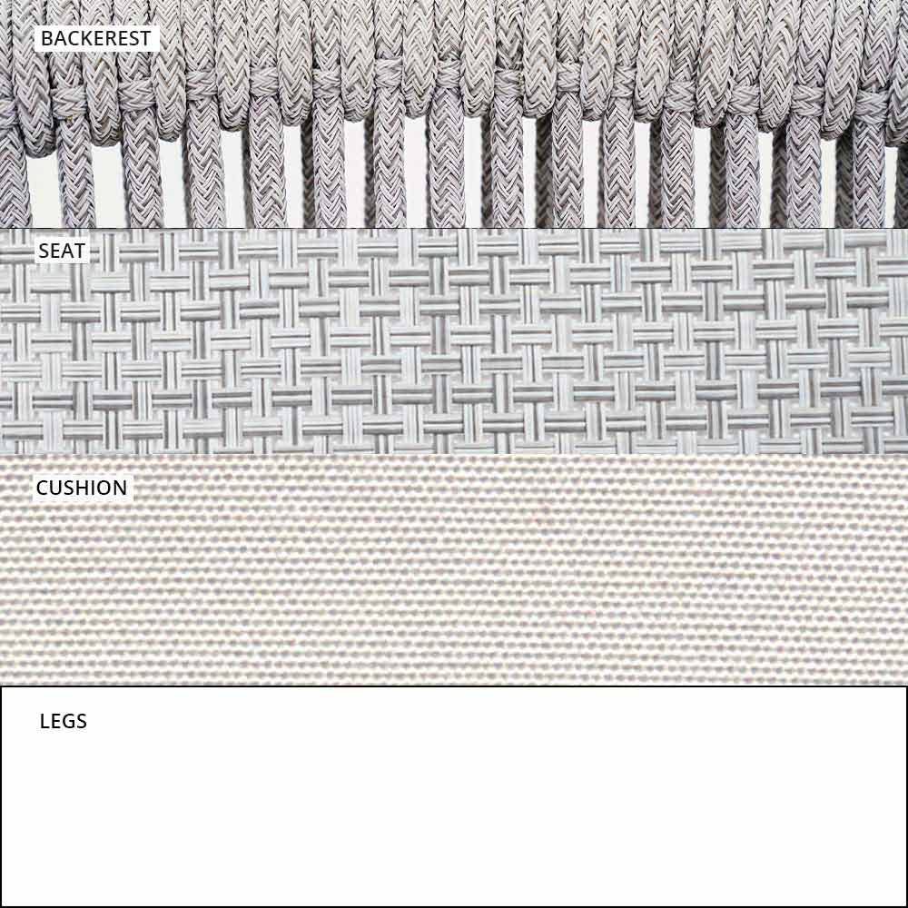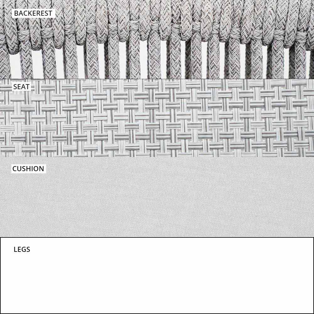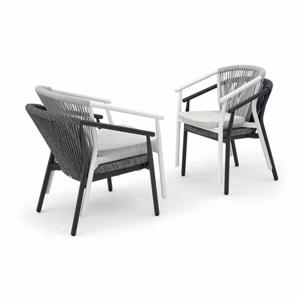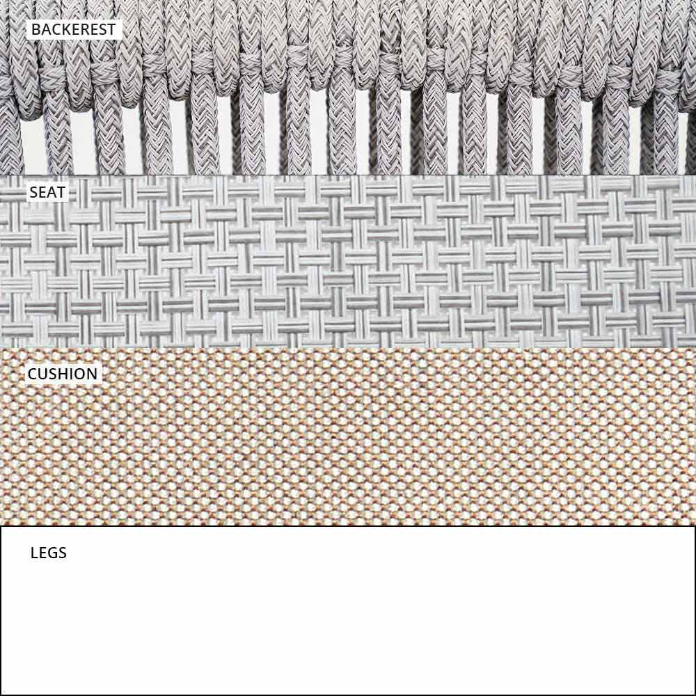 De omhullende welving van de rugleuning en de slanke lijn van de benen tekenen een elegant silhouet, versterkt door een harmonieuze verweving in synthetisch touw.