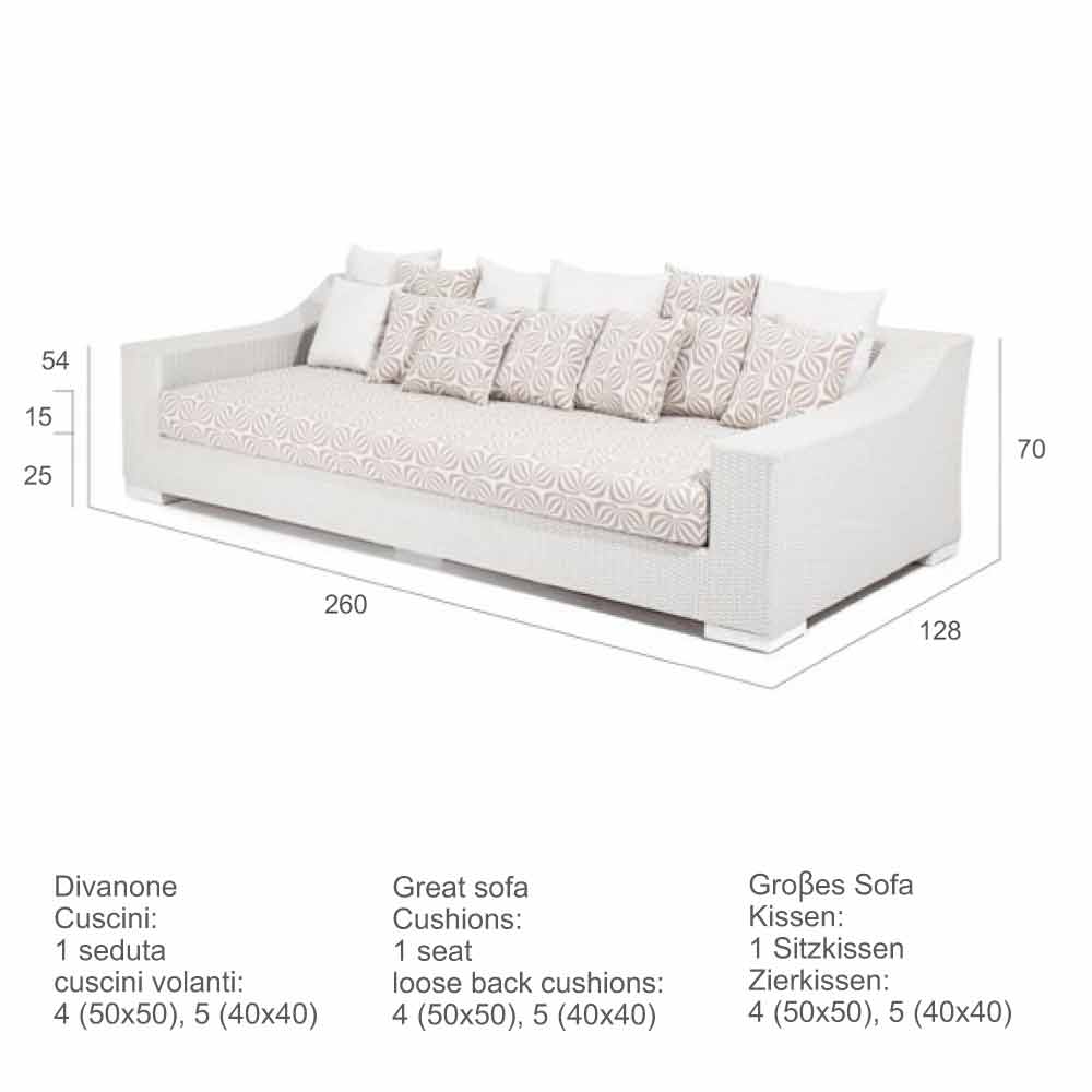 Compleet met een 'polyurethaanschuim. De bekleding bestaat uit een enkele sessie en wordt versierd met een groot aantal losse kussens, alle betrokken Tempotest een stof, waterbestendig en UV-stralen en in verschillende chromatische variaties, effen kleur.