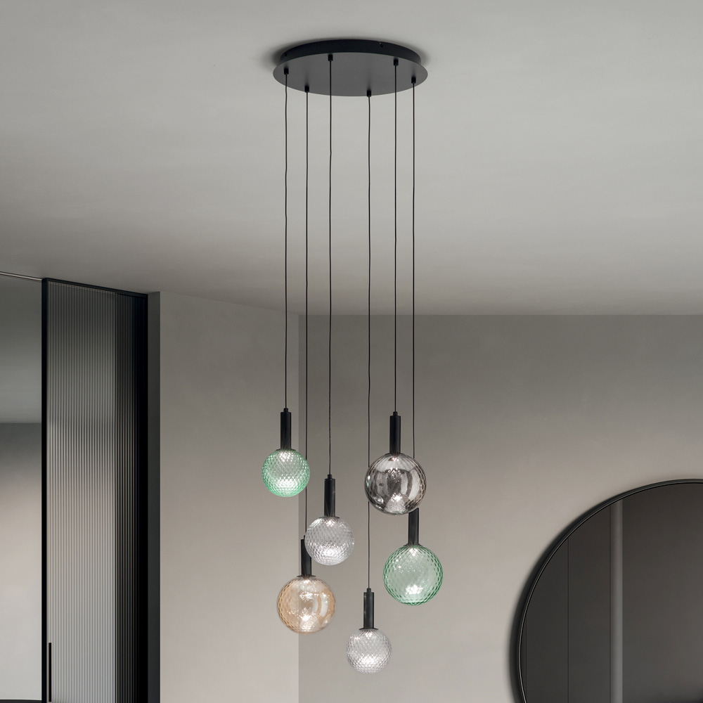 Perfect boven een eettafel of als middelpunt in een moderne woonkamer , elke bol is met precisie opgehangen, waardoor een compositie ontstaat die even artistiek als functioneel is. De verschillende glastinten voegen een vleugje klasse en onderscheid toe aan elke ruimte, door licht te reflecteren op manieren die de aandacht trekken en de kamer verlichten.