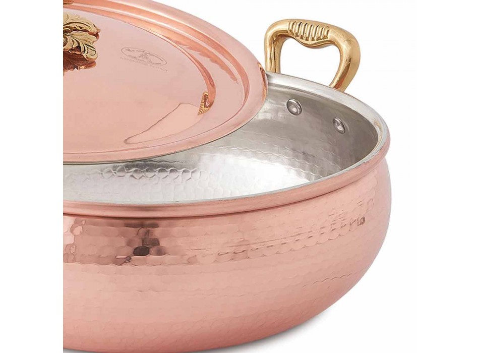 Afgeronde groenteschotel in gehamerd koper met handvatten en deksel, handgemaakt ontwerp gemaakt in Italië.