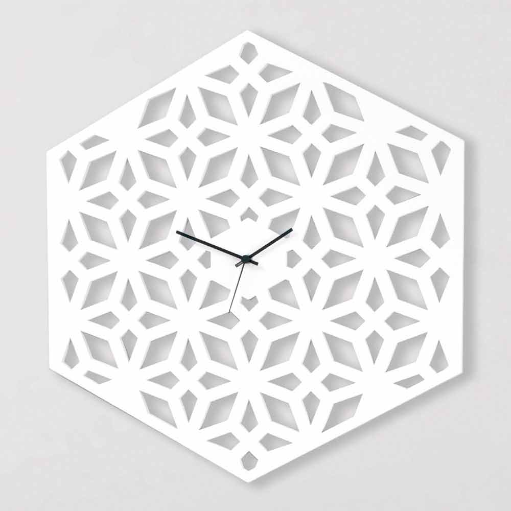 zeshoekige klok met grote impact dankzij de kleuren en details waarvan het is gemaakt, volledig in