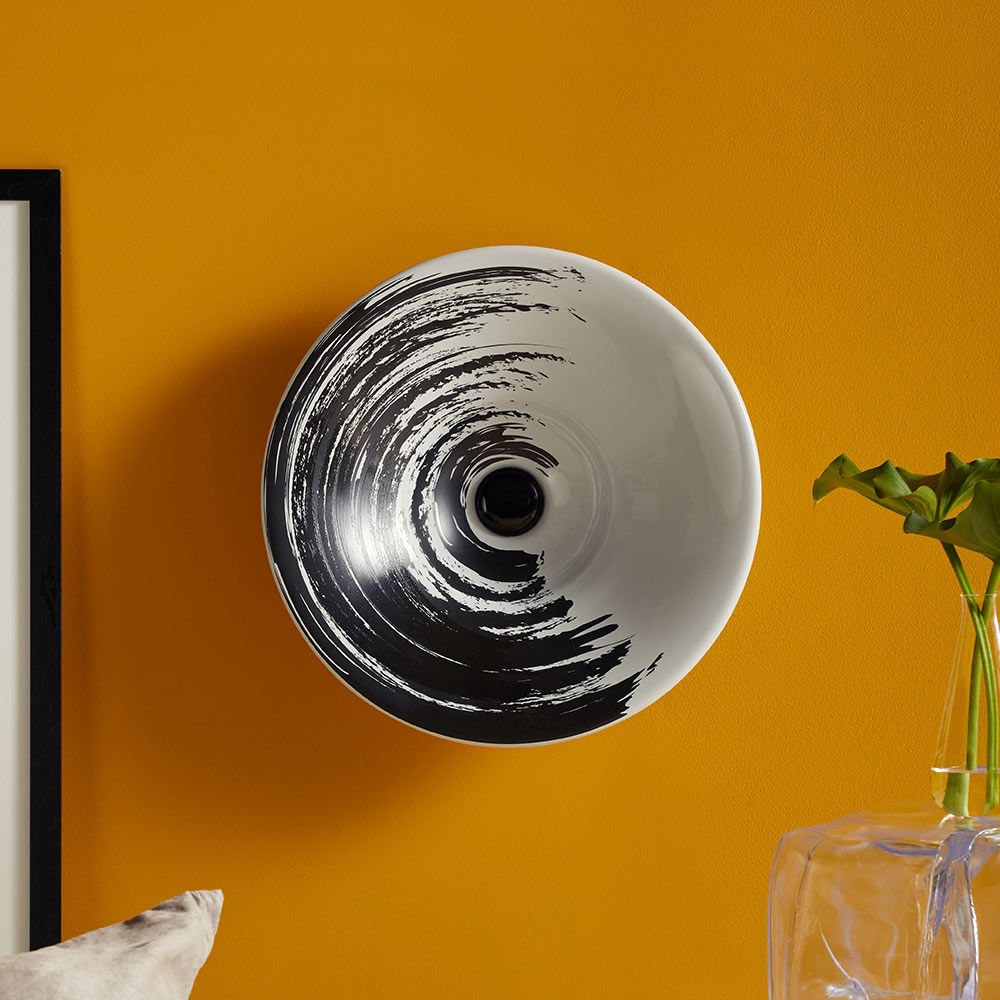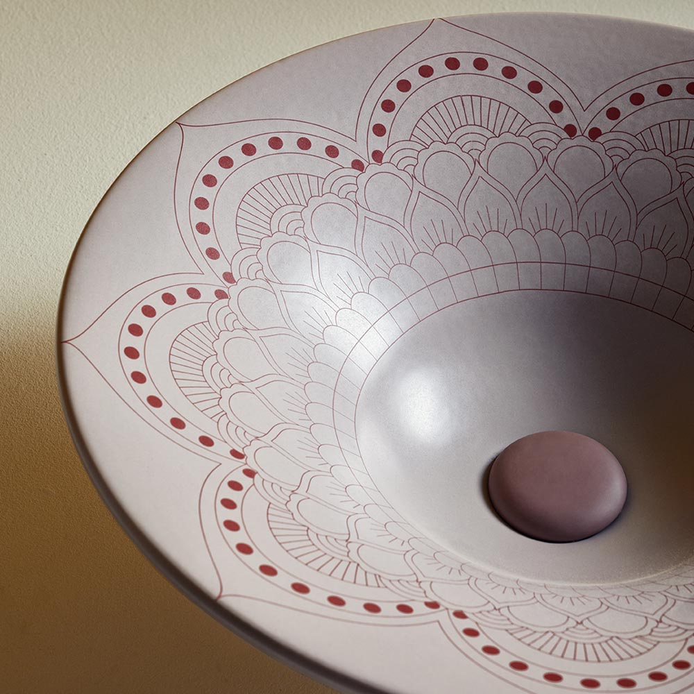 - interne mandala-reliëfdecoratie op mat grijs email, extern wit email