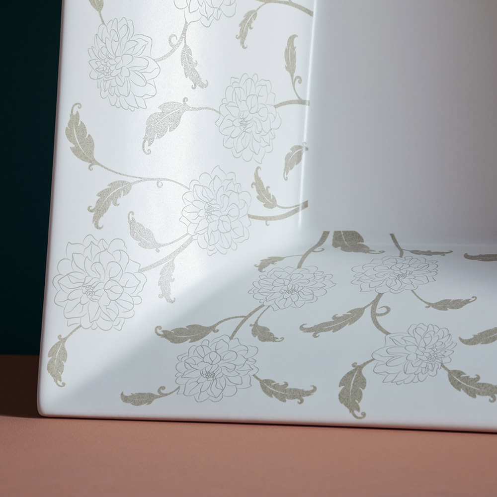 - binnendecoratie in reliëf van bloemen op mat wit email, buiten mat wit email