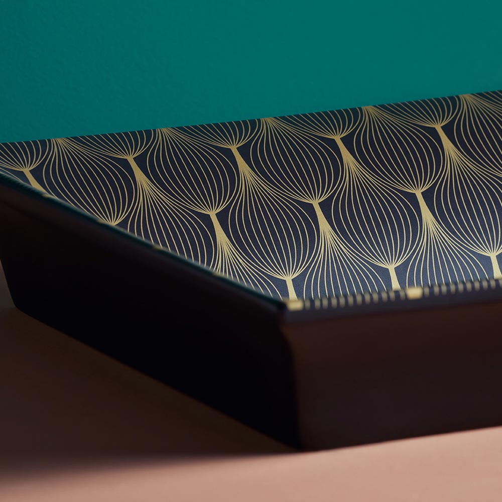 - matzwarte en gouden textuur aan de binnenkant, matzwart email aan de buitenkant