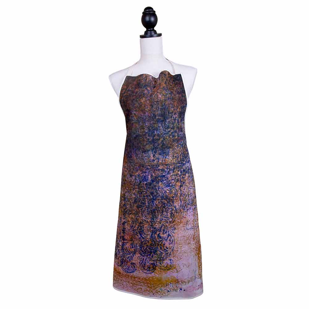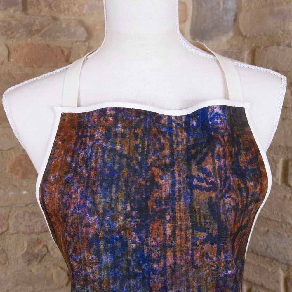 Ambachtelijk keukenschort met slabbetje van puur katoen gedecoreerd met met de hand bedrukte gekleurde artistieke motieven, uniek stuk kwaliteit made in Italy.