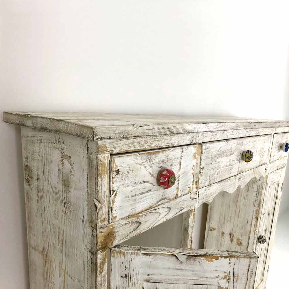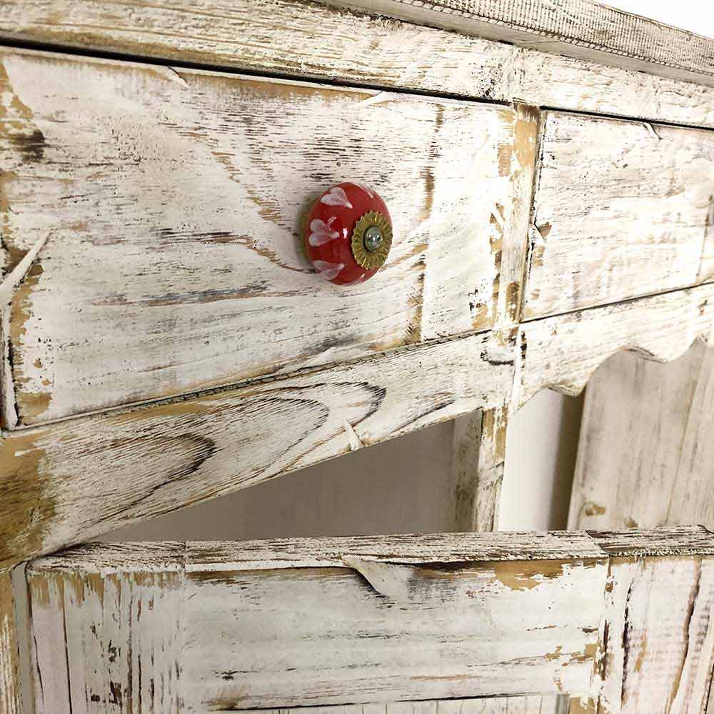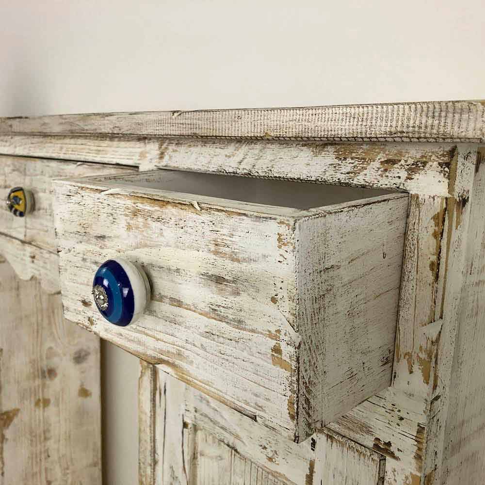 Console in massief dennenhout, volledig handgemaakt in Italië en gekenmerkt door de prachtige vlamverbrande en witgekalkte afwerking. De structuur omvat 2 deuren met interne plank en 3 lades die worden aangevuld met speciale handbeschilderde keramische knoppen waardoor je perfect georganiseerde ruimtes hebt.