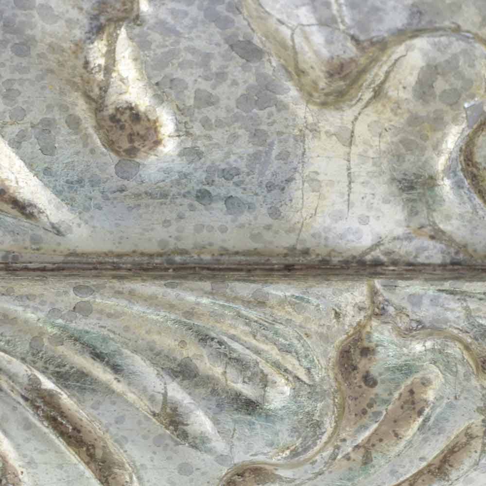 Deze elegante spiegel is een designmeesterwerk dat functionaliteit en decoratieve stijl combineert . Het frame is fijn bewerkt met in elkaar verweven bloemmotieven en past perfect bij de moderne bloemenachtergrond waarop het is geplaatst, waardoor een visueel stimulerend contrast ontstaat. Het vakmanschap is merkbaar in elk detail , van het delicate spel van licht en schaduw dat de afwerking biedt, tot de precisie van de gravures die de randen versieren.