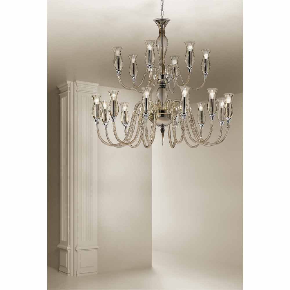 Fijne en delicate kroonluchter met 18 lichtpunten, handgemaakt van Venetië-glas in gerookte afwerking met gepolijste verchroomde metalen details, gemaakt in Italië . Uit de herinterpretatie van de klassieke en nobele vormen van glas is een nieuwe schoonheidsformule geboren, gekenmerkt door golvende en essentiële lijnen die traditionele vormen herdefiniëren en leven geven aan een inrichtingsoplossing die elke omgeving met persoonlijkheid kan vervolledigen. Wat de esthetiek verrijkt, is het gladde oppervlak van het glas waardoor het licht in verschillende richtingen kan schuiven voor een spel van transparanten dat gecombineerd wordt met de levendige lichteffecten voor een exclusief resultaat met een sterke visuele impact .