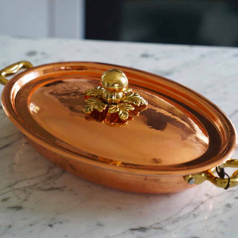 Ovale steelpan met deksel, hand vertind koperwerk met messing handgrepen made in Italy.