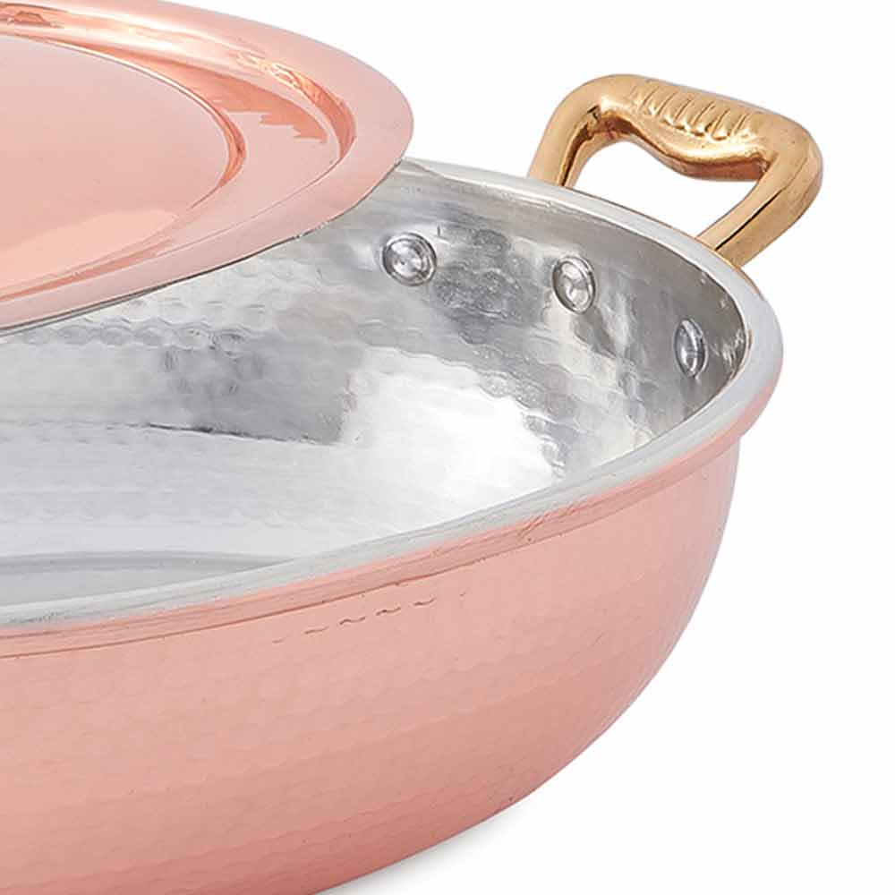 Ovale steelpan met koperen deksel en messing handgrepen, made in Italy vakmanschap.