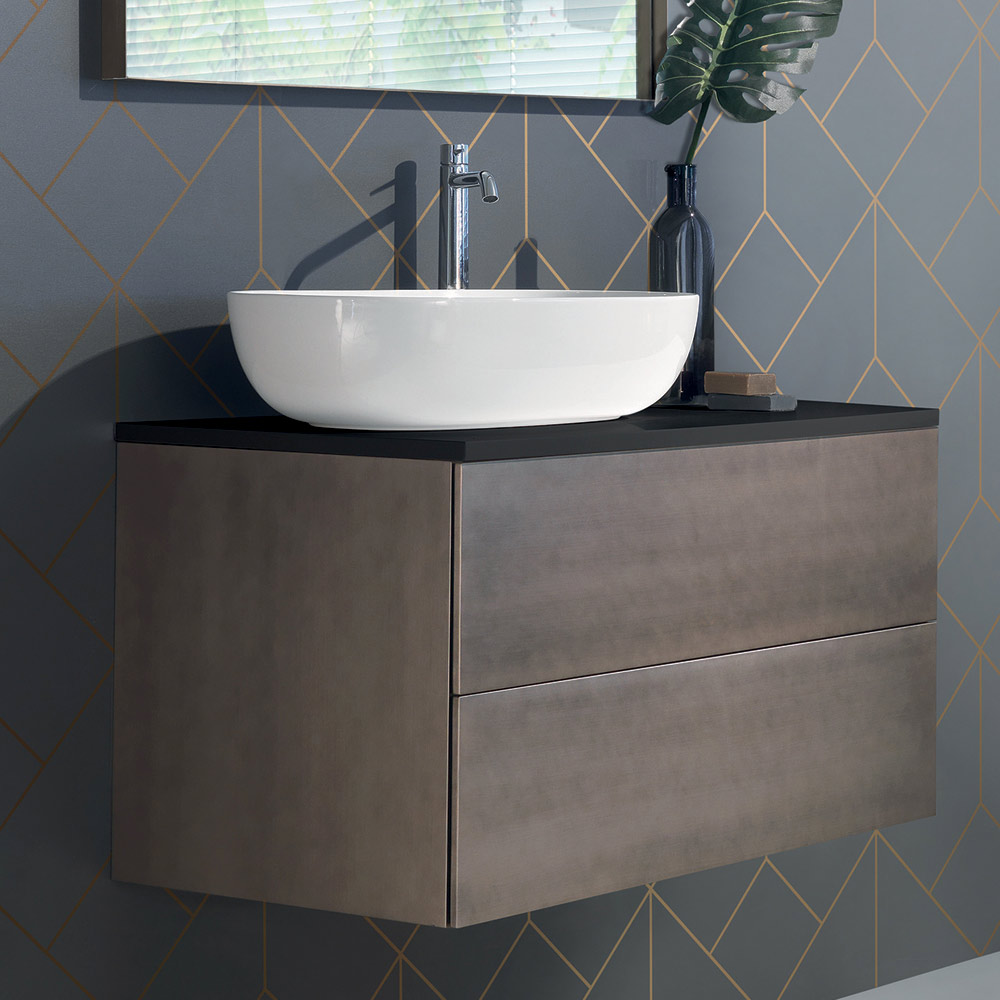 wastafelonderstel met 2 lades in MDF-hout met een kostbare mat verouderde platina gelakte afwerking en een mat zwart gelakt houten blad met witte keramische aanrechtwastafel.