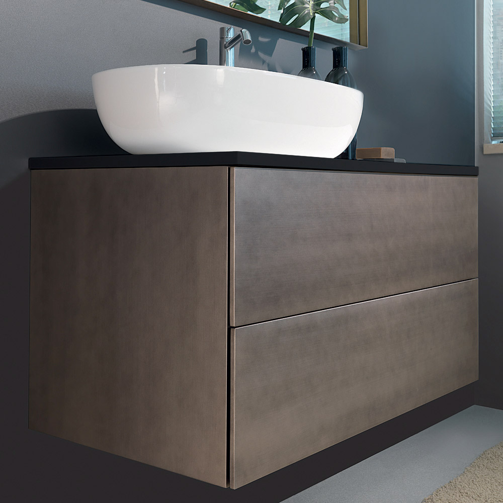 badkamermeubelsamenstelling kenmerkt zich door de puurheid van de lijnen en de zeer verfijnde afwerking.