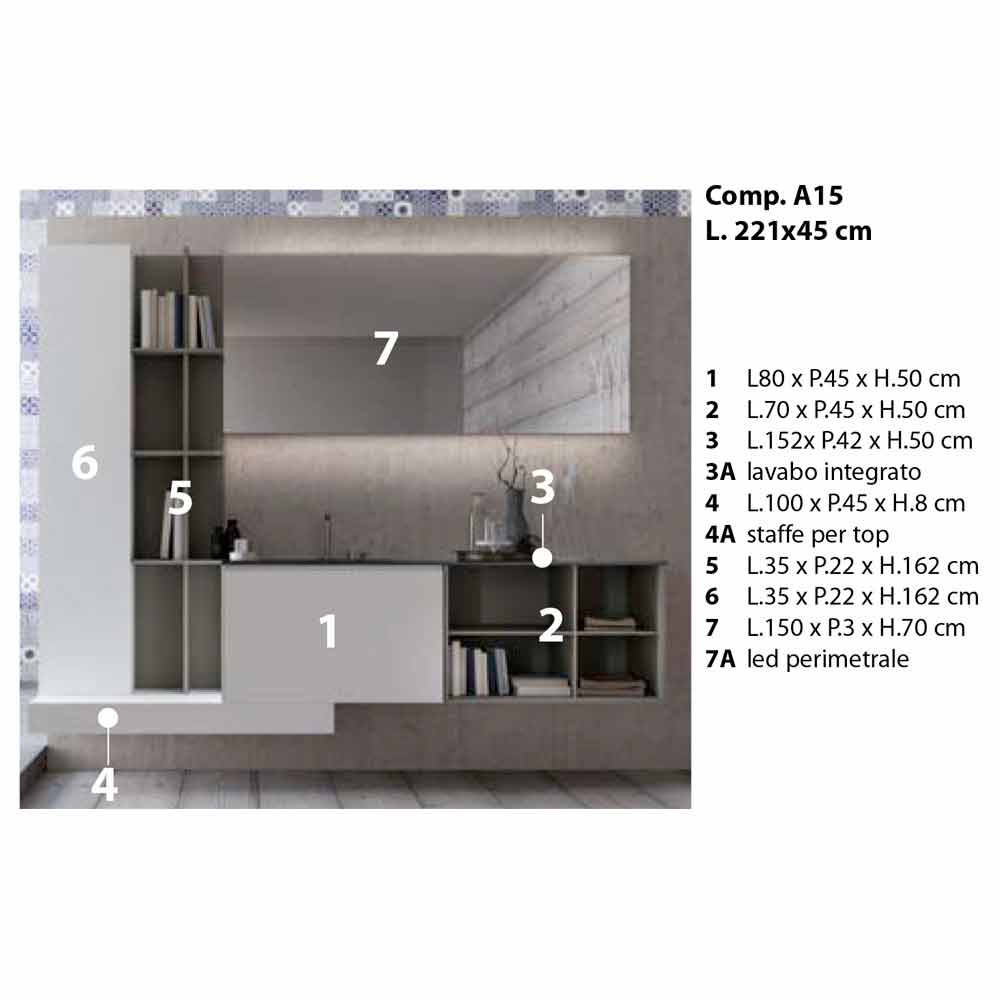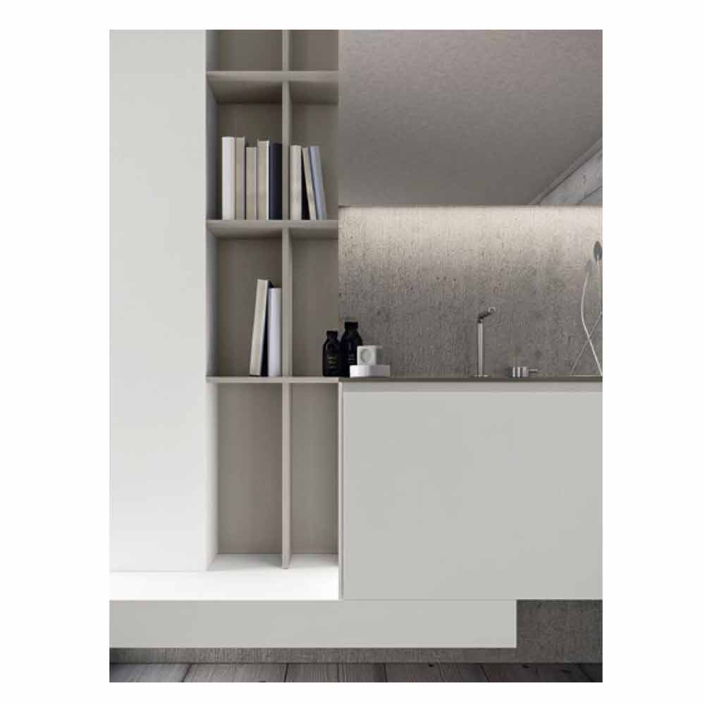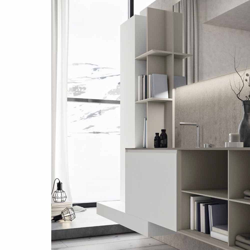 Moderne hangende badkamersamenstelling, regelmatig ontwerp met open planken, gemaakt in Italië.