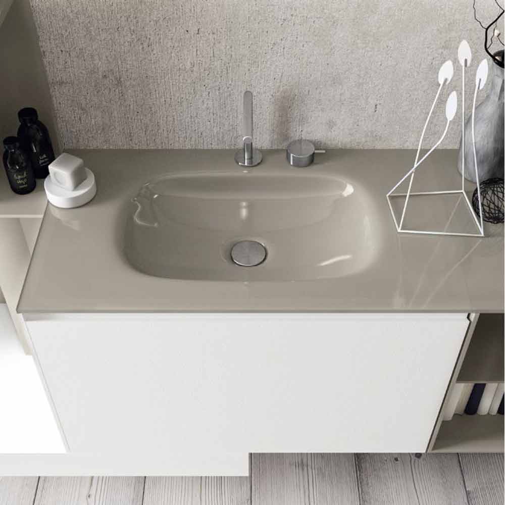 Het tafereel wordt afgesloten door de ingebouwde wastafel met zachte randen in de glasplaat.