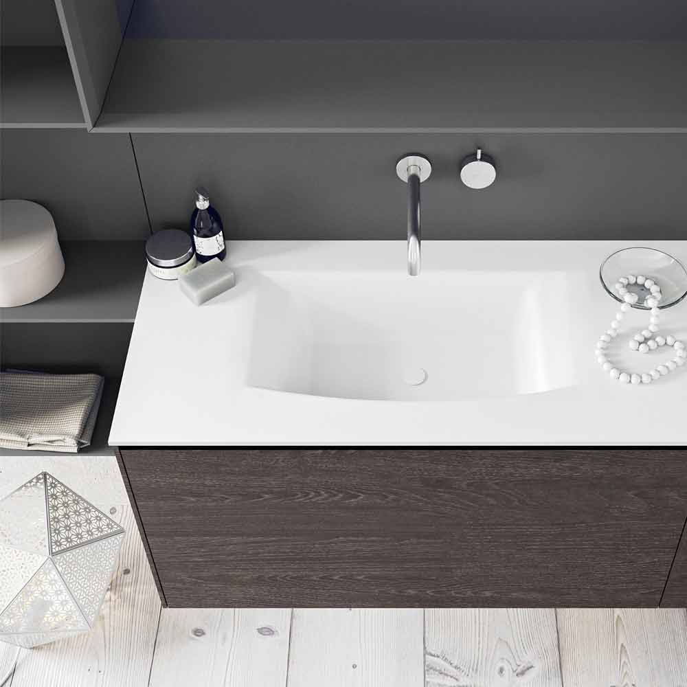 Het tafereel wordt afgesloten door de ingebouwde wastafel die wordt gekenmerkt door twee zijdelingse zijkanten die zachtjes afdalen richting het bassin.