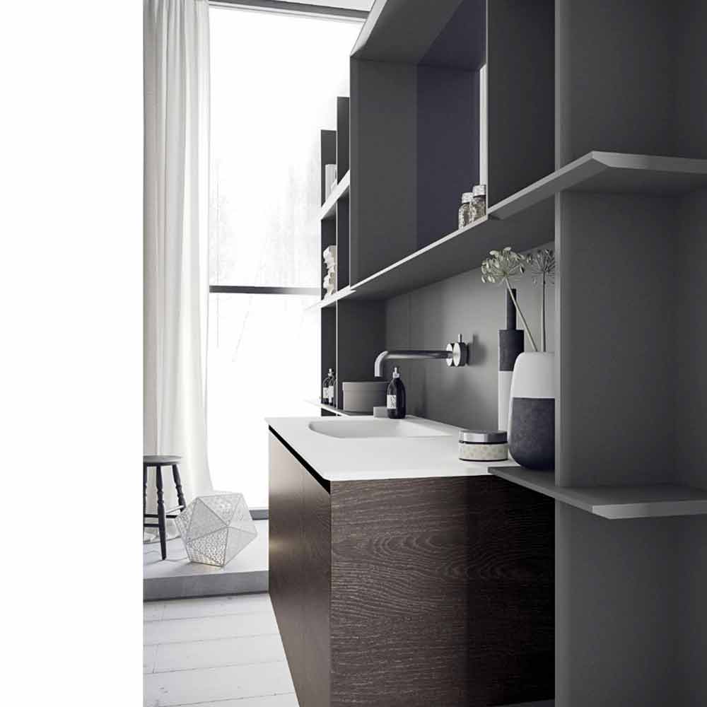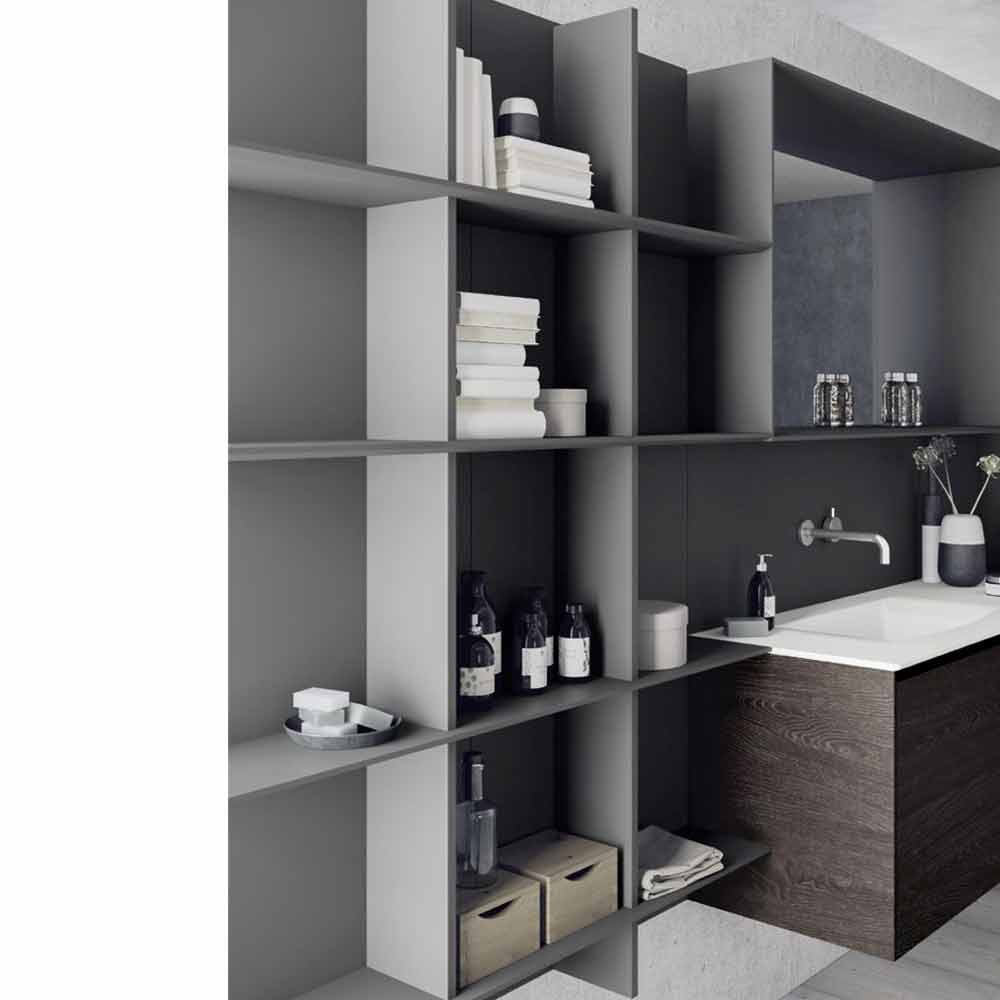 Moderne badkamersamenstelling, hangend en regelmatig ontwerp met open planken, gemaakt in Italië.