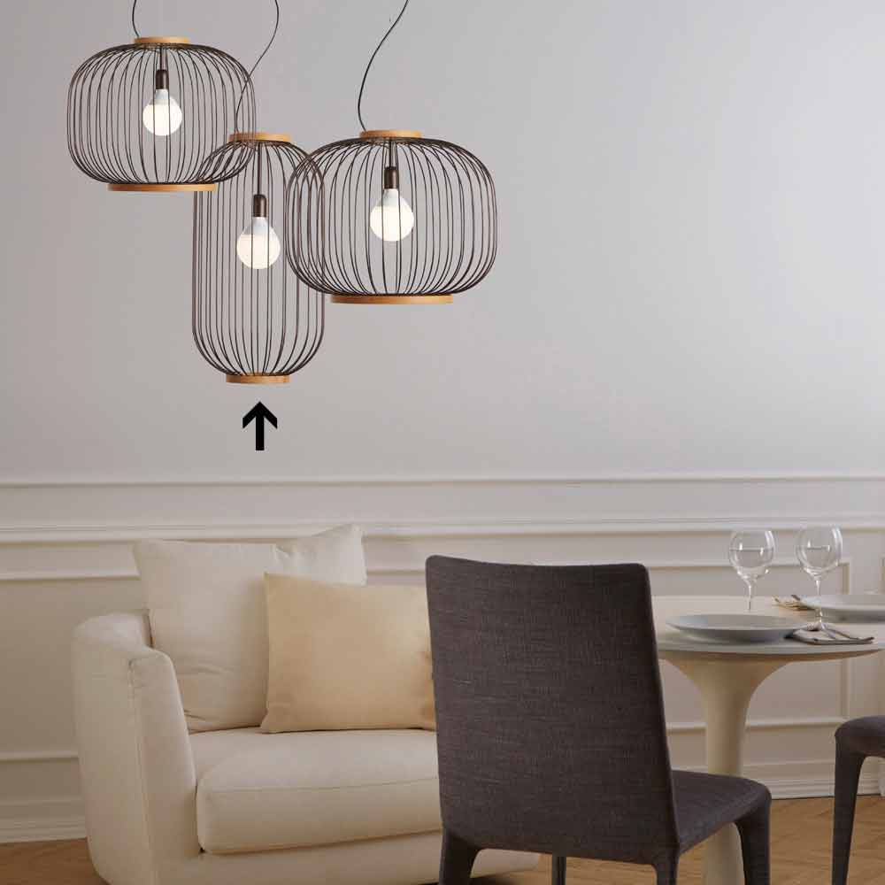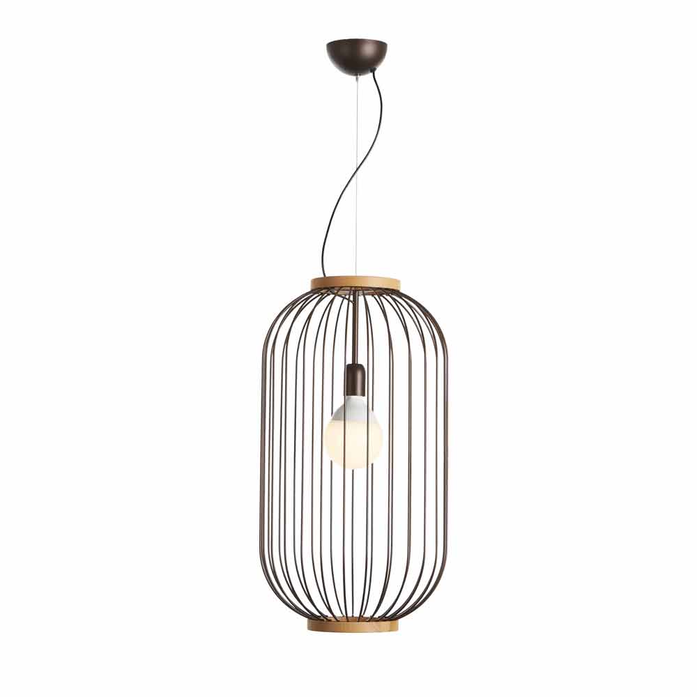 Pendelverlichting van gevormde stalen staaf en geverfd met epoxy poeders. De twee bands die het lichaam te sluiten zijn afgerond natuurlijk hout.