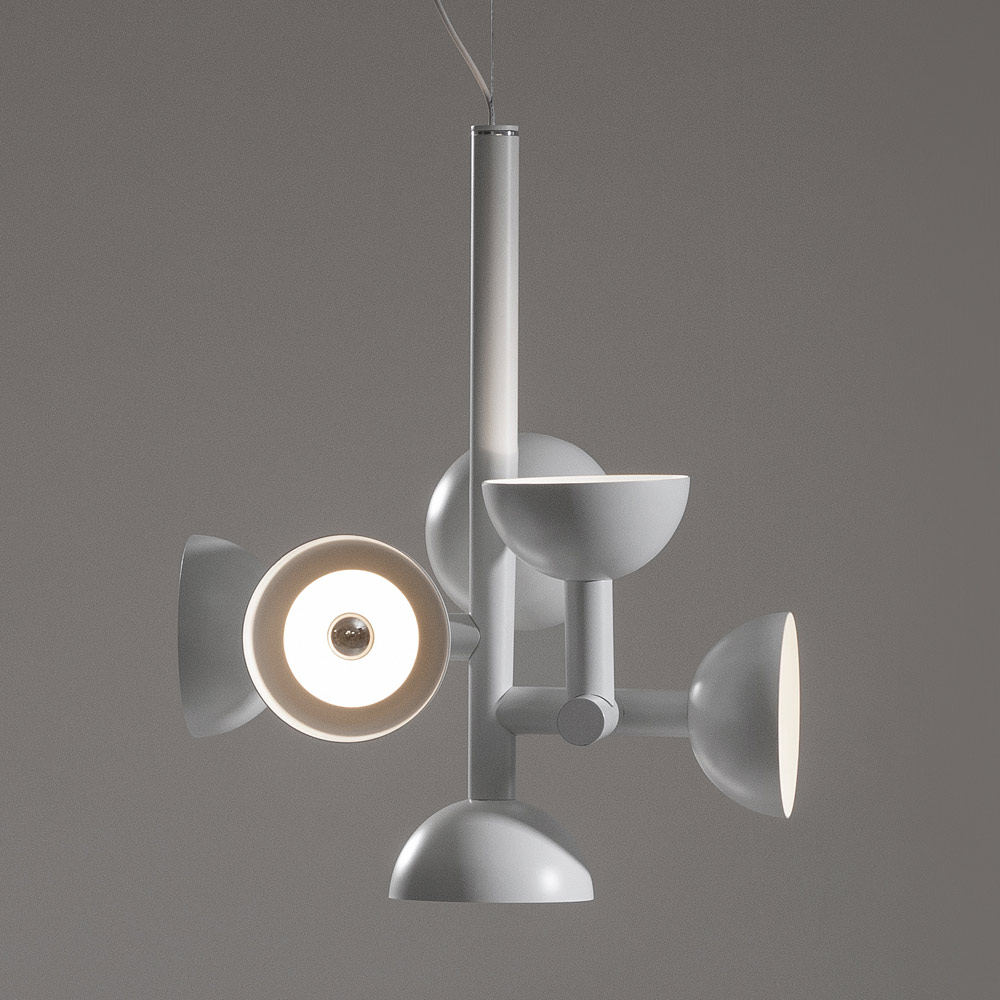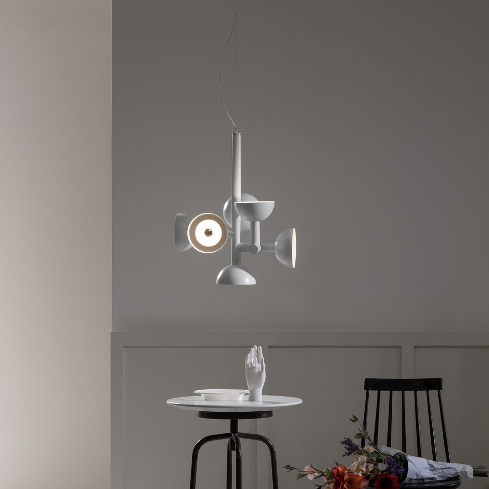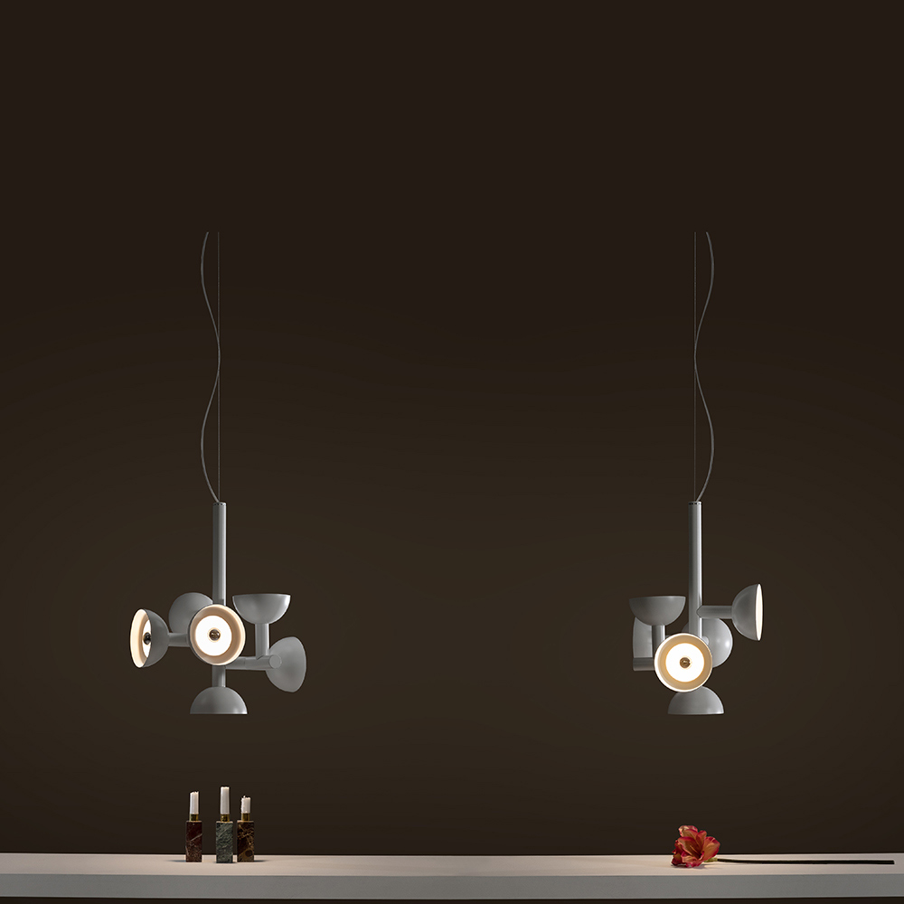 De lamp is gemaakt met een aluminium structuur van twee afwerkingen voor een volledig Italiaans ontwerp dat, door onconventionele experimenten en het voortdurende onderzoek tussen traditie en moderniteit , kan verbazen, durven en prikkelen, waardoor je je emoties kunt uiten door middel van een originele en persoonlijke decoratief gebruik van licht.