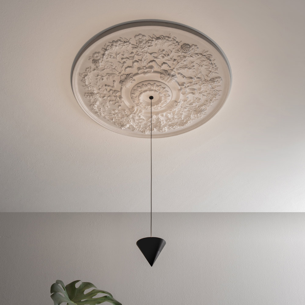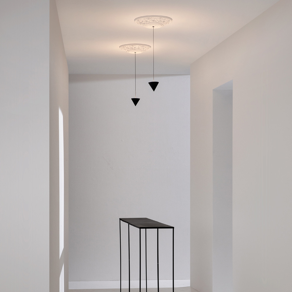 De lamp is gemaakt met een structuur van gips en aluminium voor een volledig Italiaans ontwerp dat, door onconventionele experimenten en continu onderzoek tussen traditie en moderniteit , kan verbazen, durven en prikkelen, waardoor je je emoties kunt uiten door middel van een origineel en persoonlijk decoratief gebruik van licht.