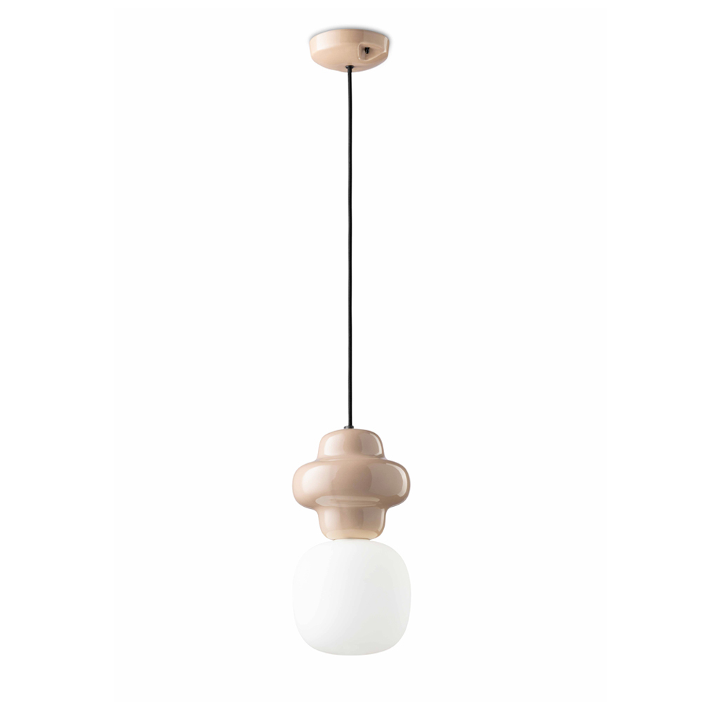 Deze elegante hanglamp belichaamt een harmonieuze ontmoeting van vakmanschap en modern design . De lamp is perfect voor degenen die de kwaliteit van Made in Italy waarderen en heeft een glanzende keramische voet, die doet denken aan traditioneel vakmanschap en een vleugje warmte toevoegt. Het ontwerp is verrijkt met een diffuser van gesatineerd opaalglas, die een zacht en uitnodigend licht produceert, ideaal voor het creëren van een comfortabele en ontspannen sfeer in elke omgeving.