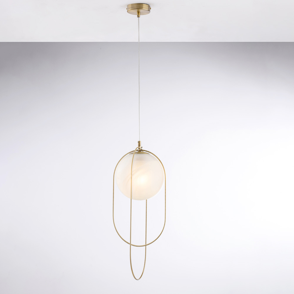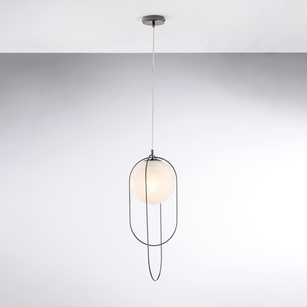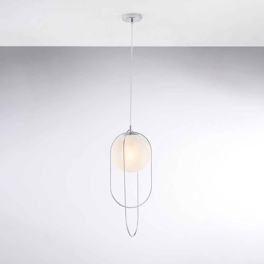 Eenvoudig en verfijnd, deze design hanglamp van ijzer met glazen bol is een eigentijdse verlichtingsoplossing, ontworpen voor mensen die strakke lijnen en ingetogen elegantie waarderen. De slanke metalen structuur omsluit een lichtgevende bol met een diameter van 20 cm , waardoor een verfijnde balans tussen vorm en licht ontstaat.