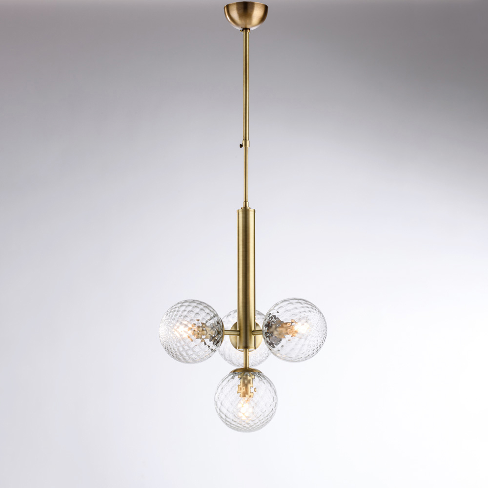 Elegant en eigentijds, deze handgemaakte hanglamp van ijzer onderscheidt zich door zijn evenwichtige en verfijnde ontwerp. De centrale verticale structuur ondersteunt vier bolvormige glazen diffusers , waardoor een harmonieuze lichtcompositie ontstaat die het licht gelijkmatig en omhullend verspreidt.