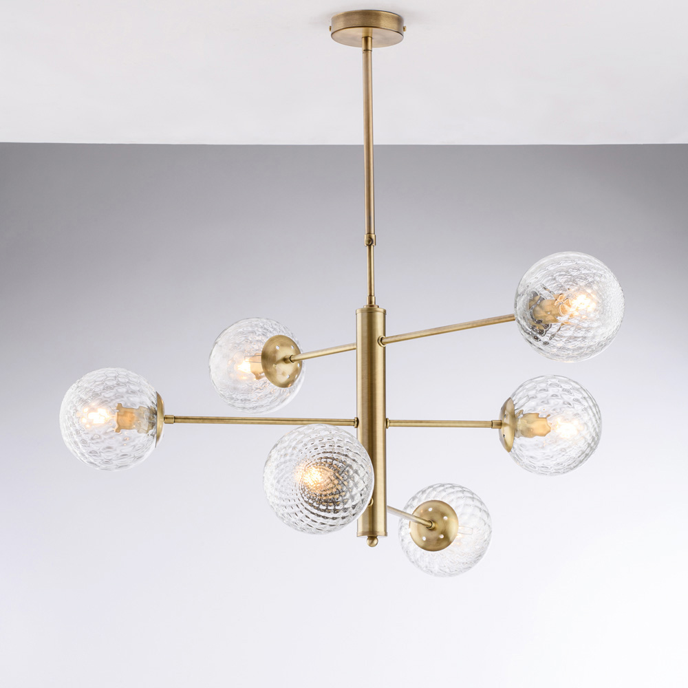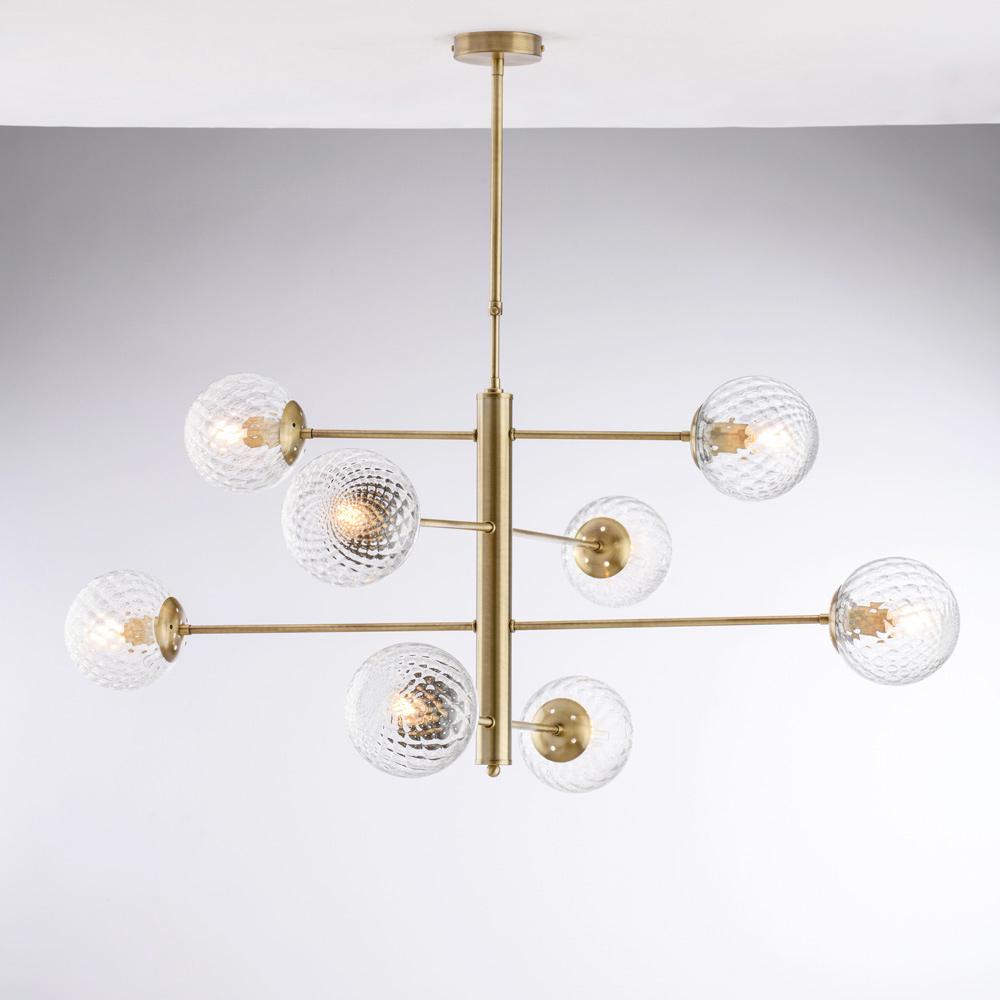 Elegant en eigentijds, deze handgemaakte hanglamp van ijzer valt op door zijn evenwichtige, geometrische compositie. De horizontale armen ondersteunen bolvormige glazen diffusers, waardoor een verfijnd samenspel van symmetrieën ontstaat dat een diffuus, harmonieus licht verspreidt.