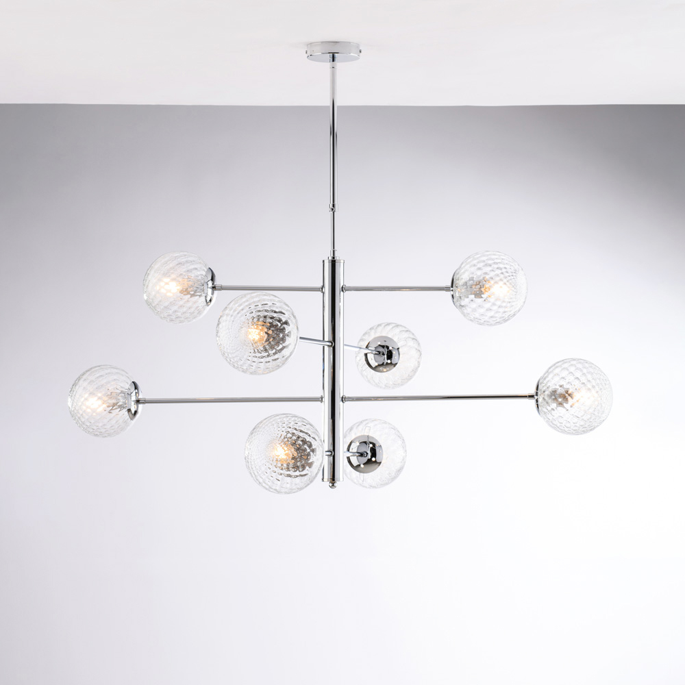 Deze hanglamp is verkrijgbaar in gepolijst chroom of brons en past perfect in moderne woonkamers , eetkamers , open ruimtes , designinterieurs en projectinrichtingen . De combinatie van metaal en glas benadrukt de uitmuntende kwaliteit van Italiaans vakmanschap , met bijzondere aandacht voor detail en proporties.