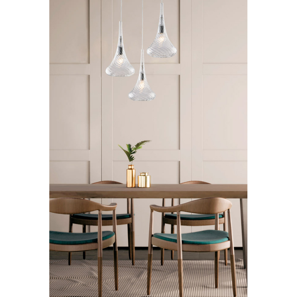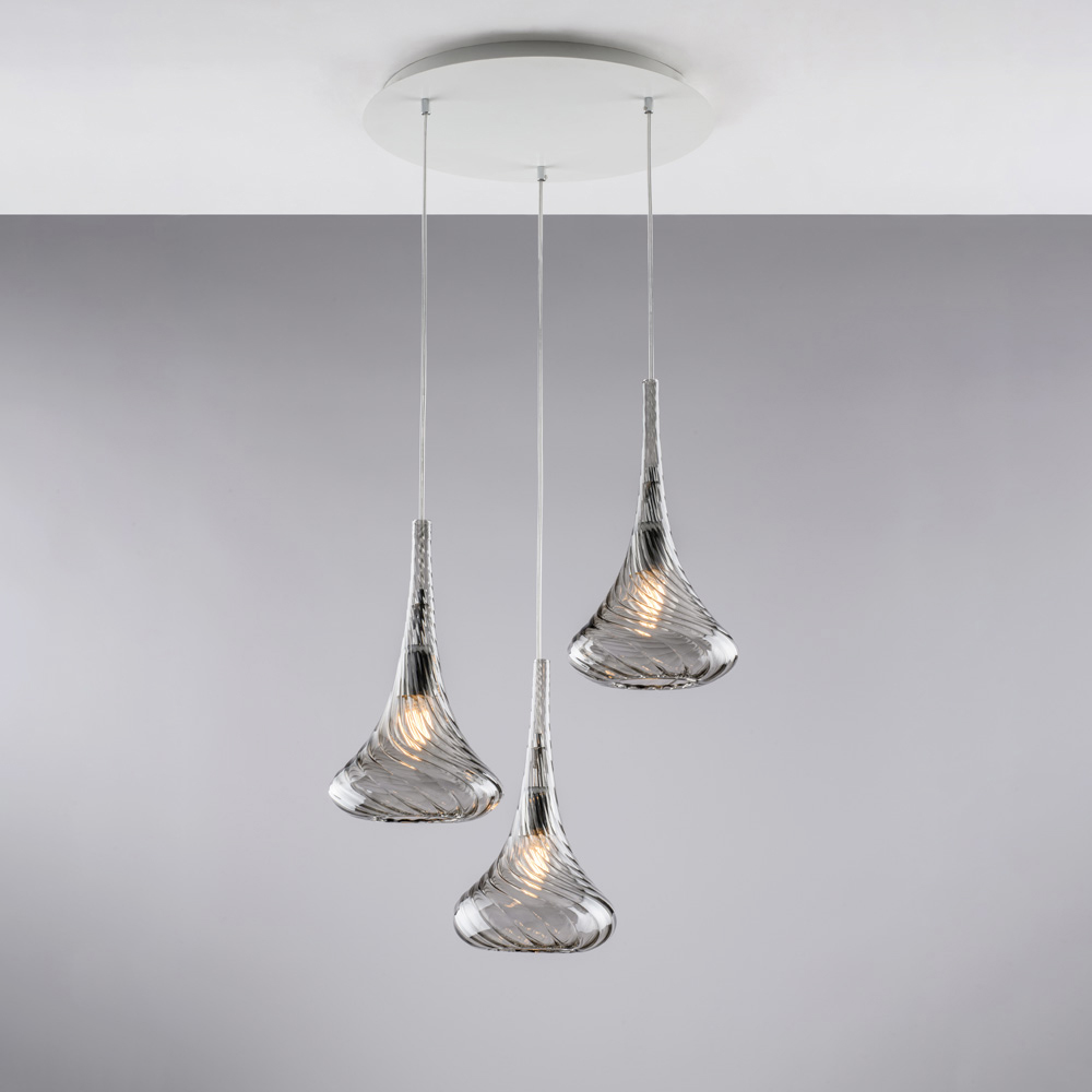 Lichtgewicht en elegant: deze handgemaakte ijzeren hanglamp met Pyrex-glas is een verlichtingsoplossing met een verfijnd en eigentijds design. De drie Pyrex-glazen diffusers , met hun zachte en golvende vormen, hangen afzonderlijk en creëren een aangenaam dynamisch effect en een harmonieuze, omhullende lichtverspreiding.