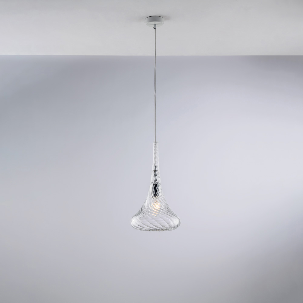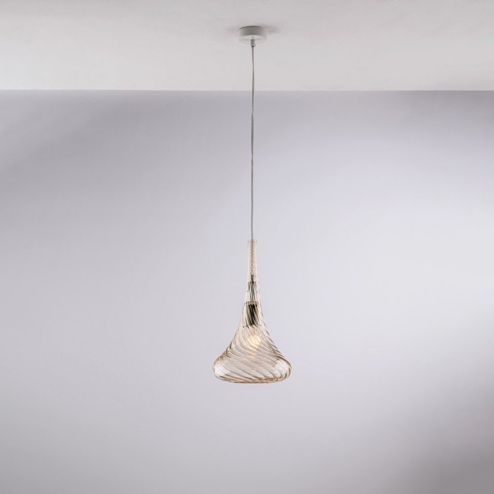 Deze hanglamp is verkrijgbaar in transparant , amberkleurig of grijs en past zich gemakkelijk aan diverse interieurs aan: helder en minimalistisch in de transparante versie, warm en sfeervol in amberkleurig, en ingetogen en elegant in grijs. Hij is ideaal voor keukens , kookeilanden , eettafels , hallen , leeshoeken en designruimtes , zowel afzonderlijk als in combinatie met andere lampen.