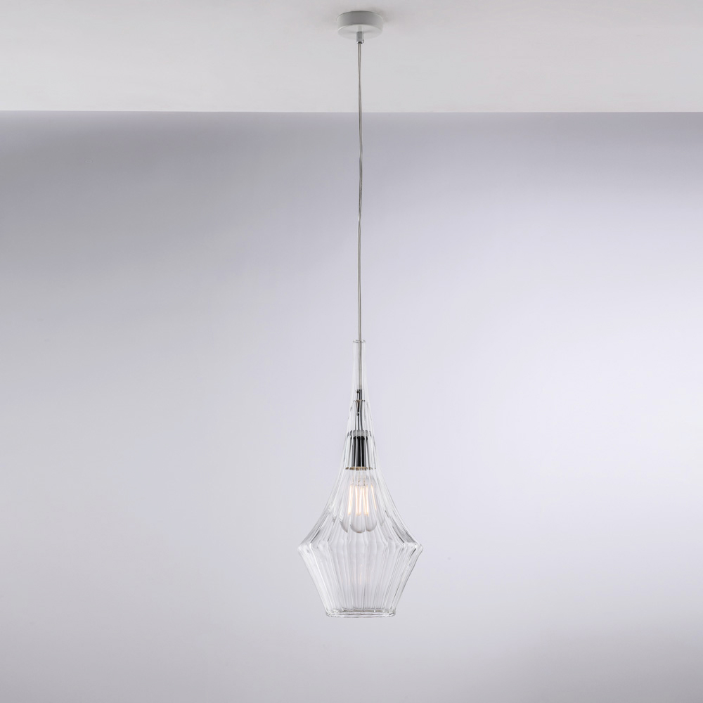 Eenvoudig en verfijnd, deze handgemaakte ijzeren hanglamp met Pyrex-glas is een eigentijdse verlichtingsoplossing, ideaal om ruimtes te verfraaien met elegantie en licht. De enkele Pyrex-glazen diffuser , met zijn geometrische en facetvormige ontwerp, verspreidt het licht gelijkmatig en creëert een uitnodigende en verfijnde sfeer.