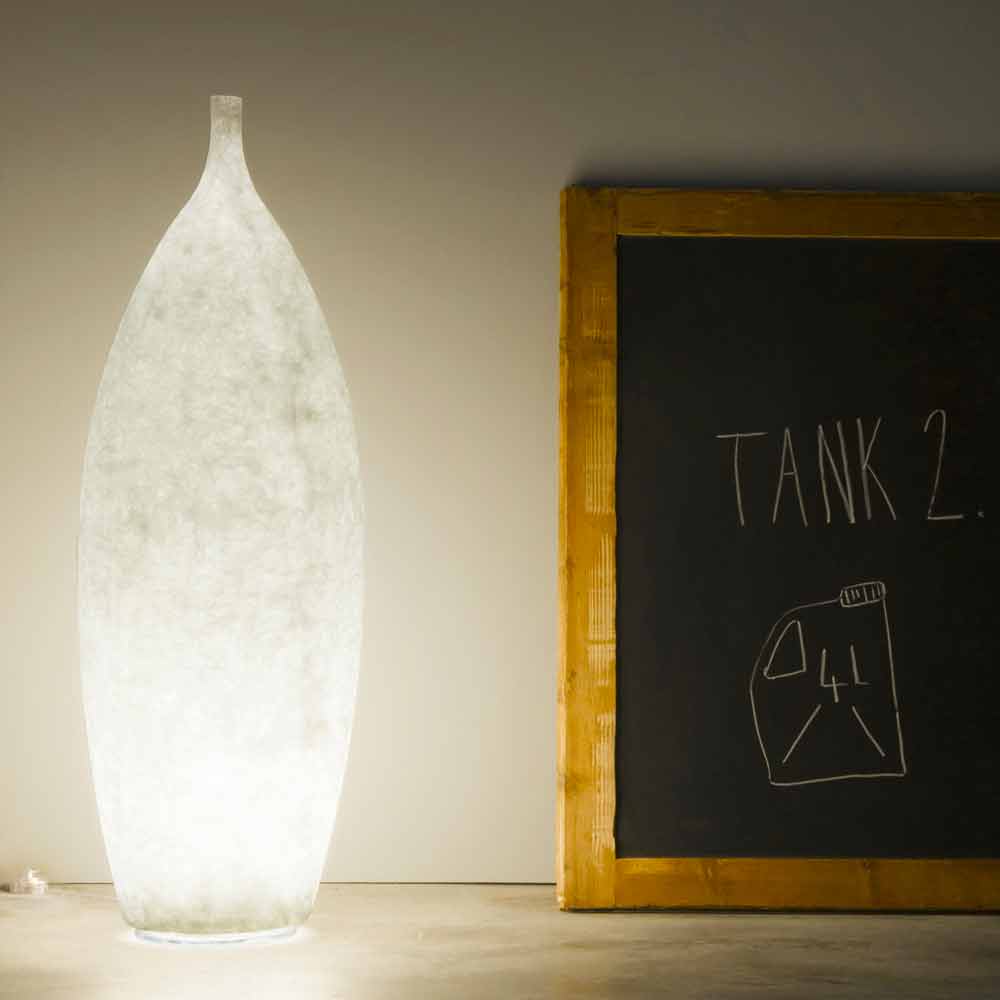 De moderne Tank 2 vloerlamp is ontworpen door In-es.artdesign voor de collectie Luna is in staat om een interessant maanbeeld na te bootsen , dankzij het materiaal waarmee het is gemaakt: de Nebulite® , een materiaal dat bestaat uit hars en vezels, met aderkarakteristieken.