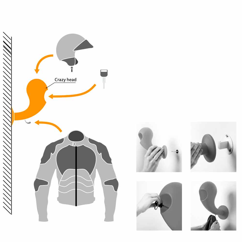 Een absolute nieuwigheid, de Crazy Head- helmhouder is voorbestemd om een onmisbare must te worden in de huizen van motor-, scooter- en fietsliefhebbers. Voorgesteld door Myyour als een origineel en leuk meubelstuk, transformeert het zijn functionaliteit in multifunctionaliteit dankzij het handige zaklegercompartiment en de praktische kleerhanger. Hij kan ook worden gebruikt als innovatieve en stijlvolle hoedenhouder.