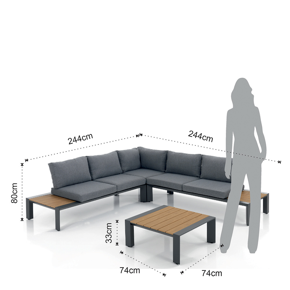 | Maatregelen | bank: 244x244x80 cm / salontafel: 74x74x33 cm |