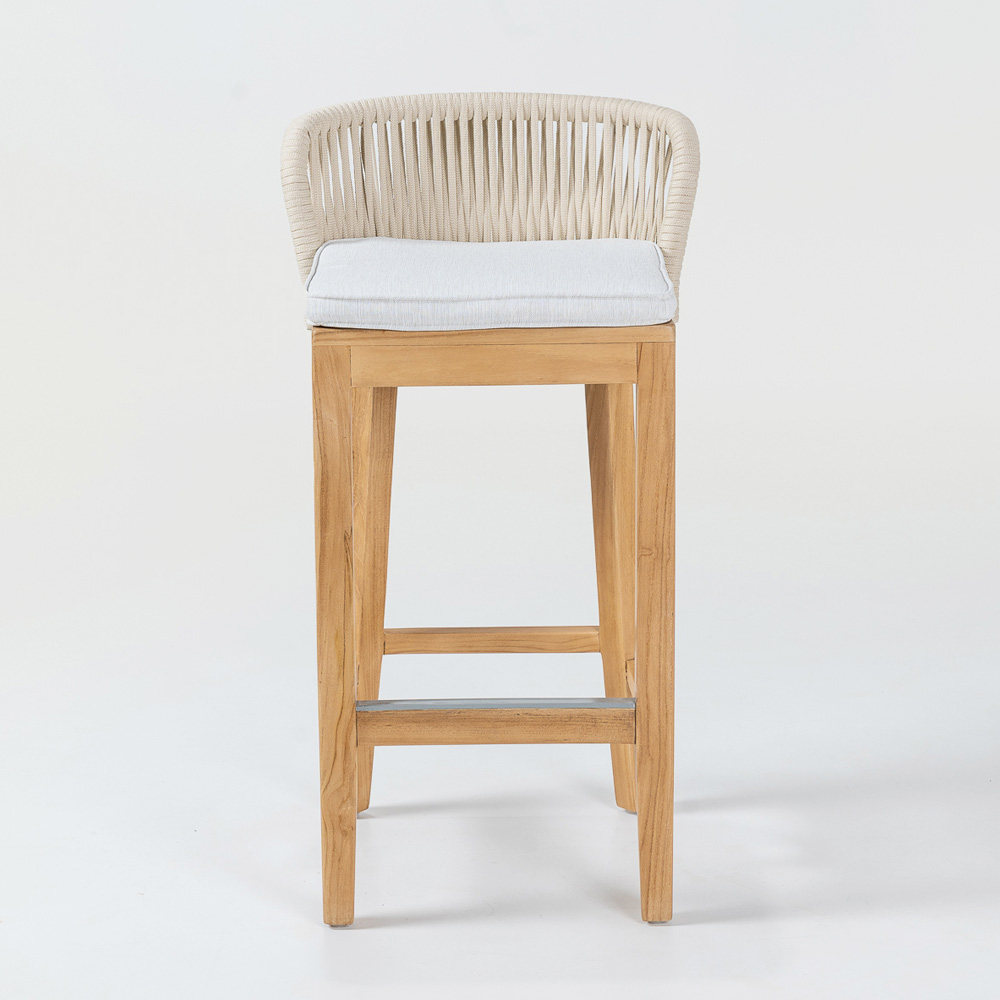 Deze elegante en veelzijdige barkruk heeft een frame van natuurlijk teakhout en aluminium , wat zorgt voor de perfecte combinatie van stevigheid en lichtheid . Het Havana grijze stoffen kussen biedt uitstekend comfort, terwijl het vlechtwerk van Olefin/PP-touw niet alleen een vleugje verfijning toevoegt, maar ook weerbestendig is, waardoor de kruk ideaal is voor zowel binnen- als buitengebruik.