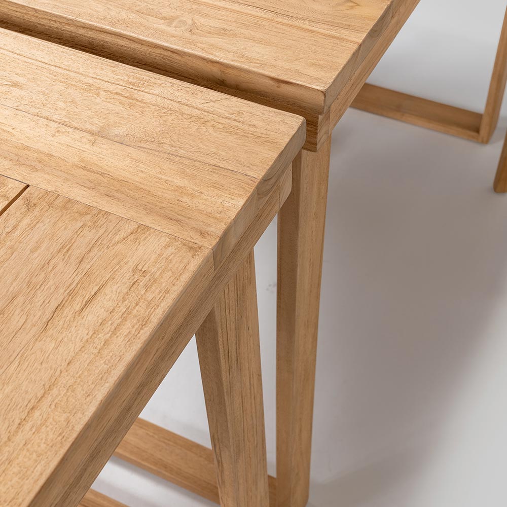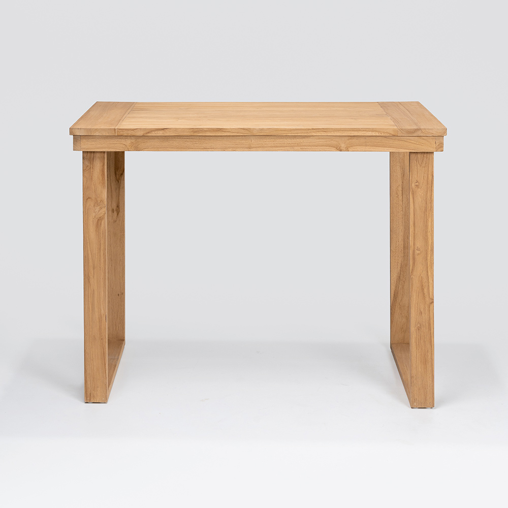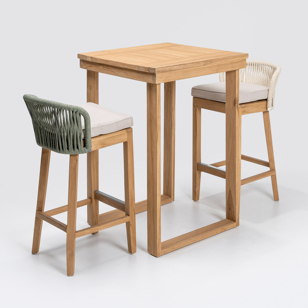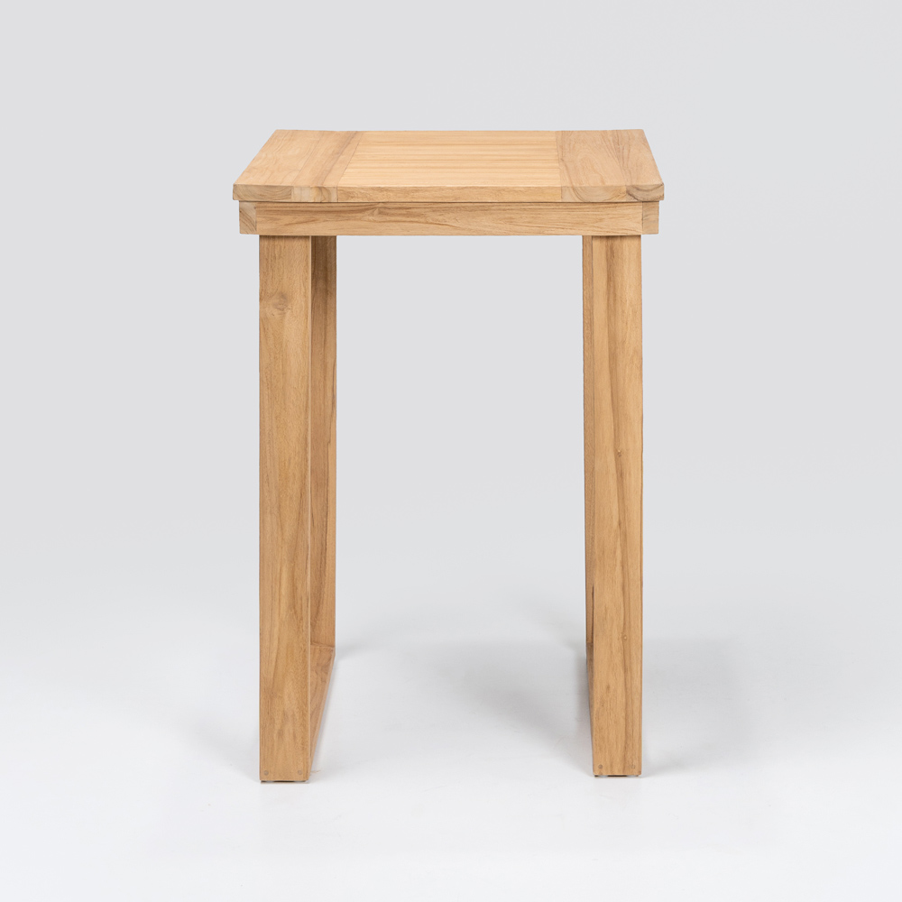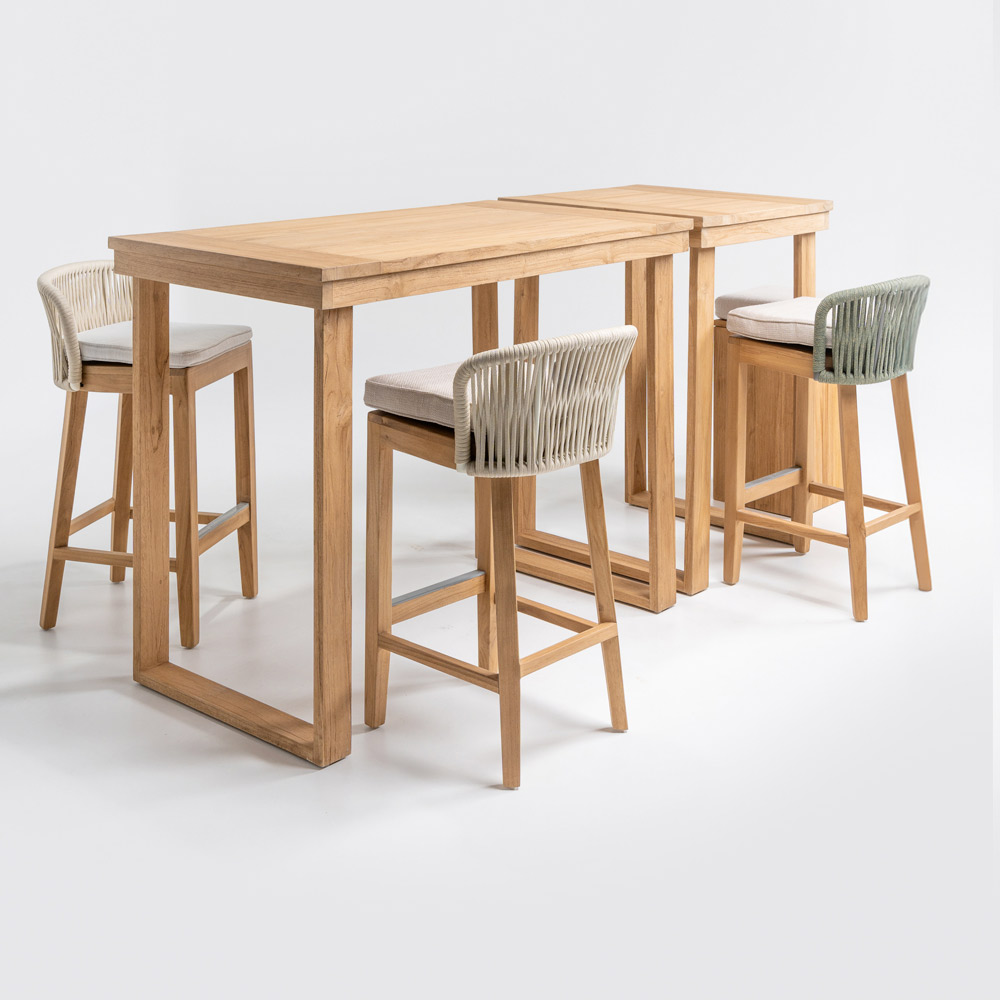 Deze elegante hoge bartafel is de perfecte combinatie van verfijnd design en natuurlijke materialen . Vervaardigd uit een massief frame van geborsteld natuurlijk teakhout , is elk detail ontworpen om duurzaamheid en weerstand te garanderen, terwijl het blad van geborsteld natuurlijk teakhout een glad en verfijnd oppervlak biedt en de schoonheid van het hout met zijn unieke nerf benadrukt.