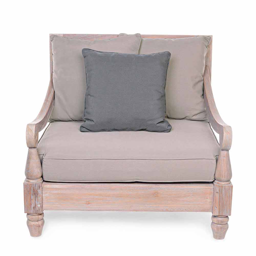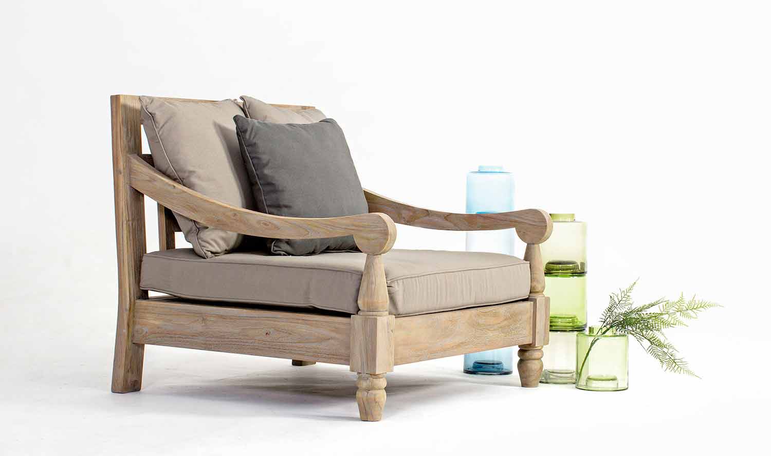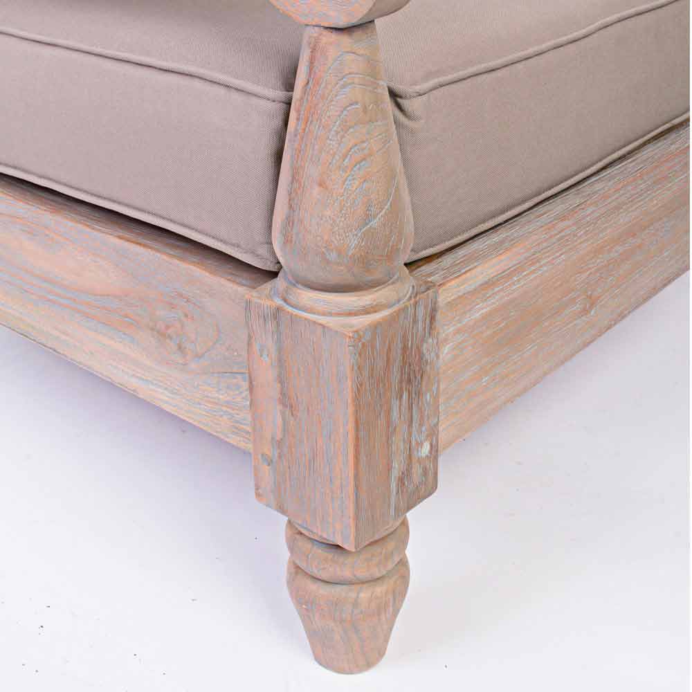 100% FSC teakhout, gezandstraald en verouderde afwerking op waterbasis. Verwijderbare kussens met zonwerende alkeenstof (100% polypropyleen).