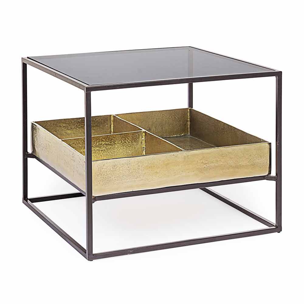 Salontafel in industriële stijl met glazen blad en stalen structuur.