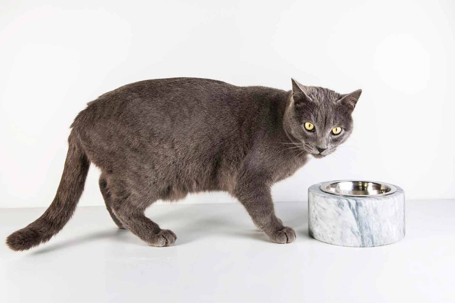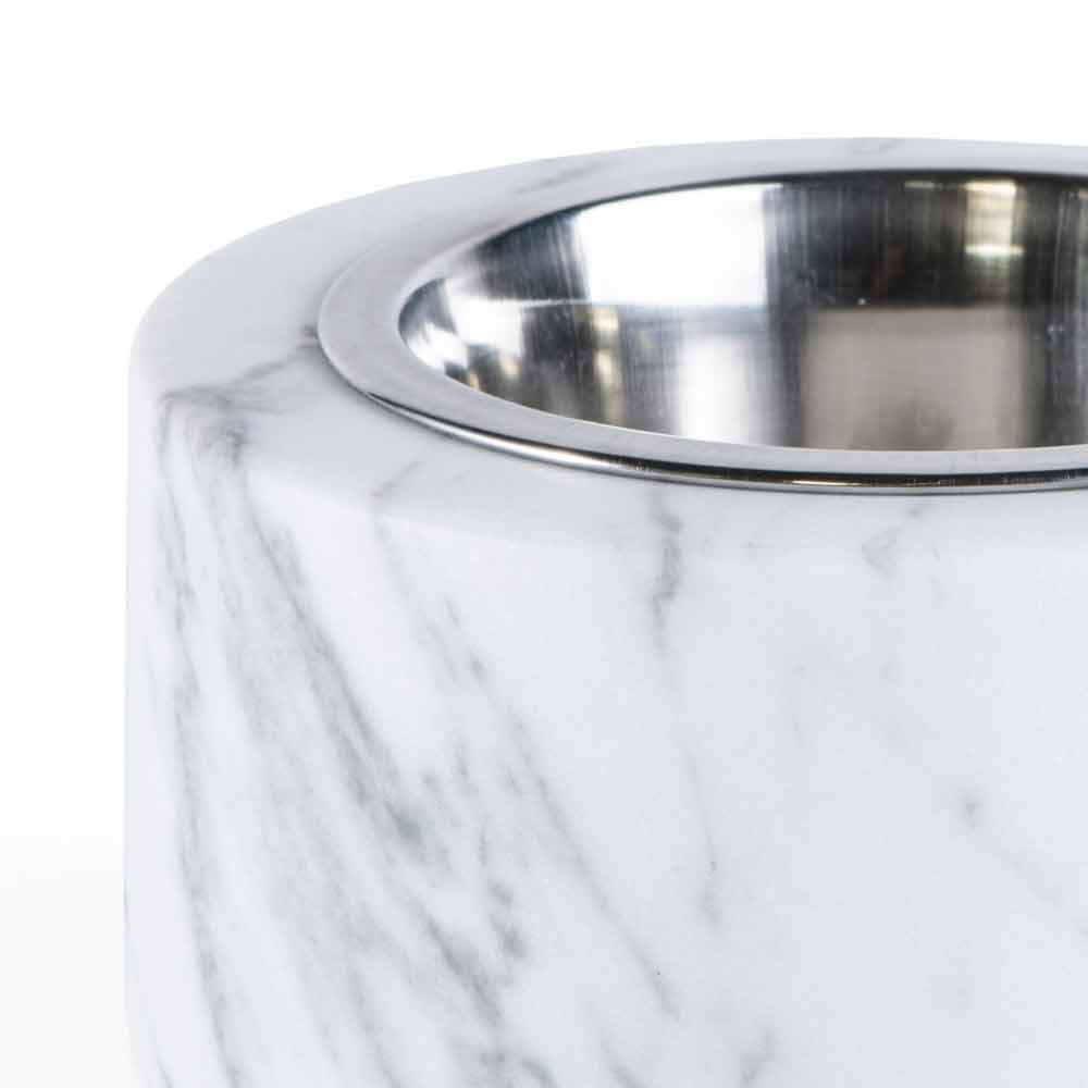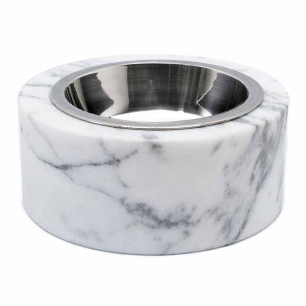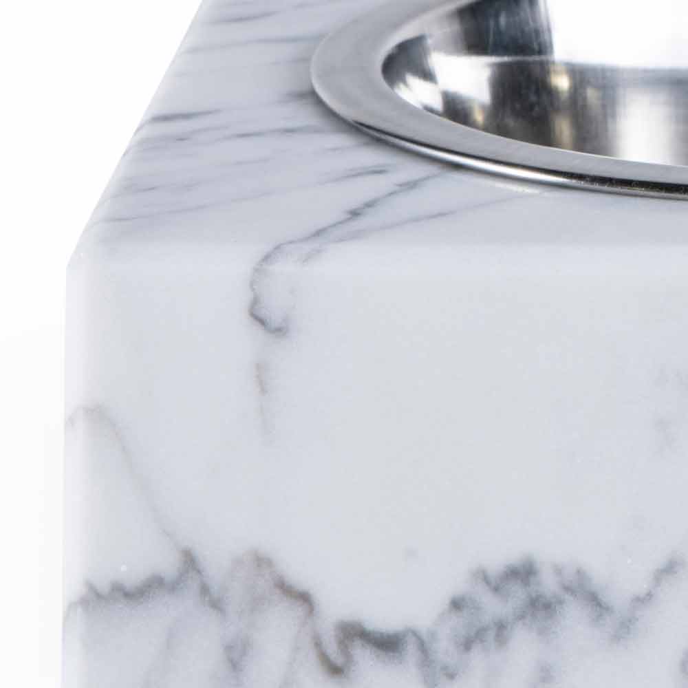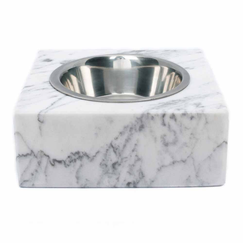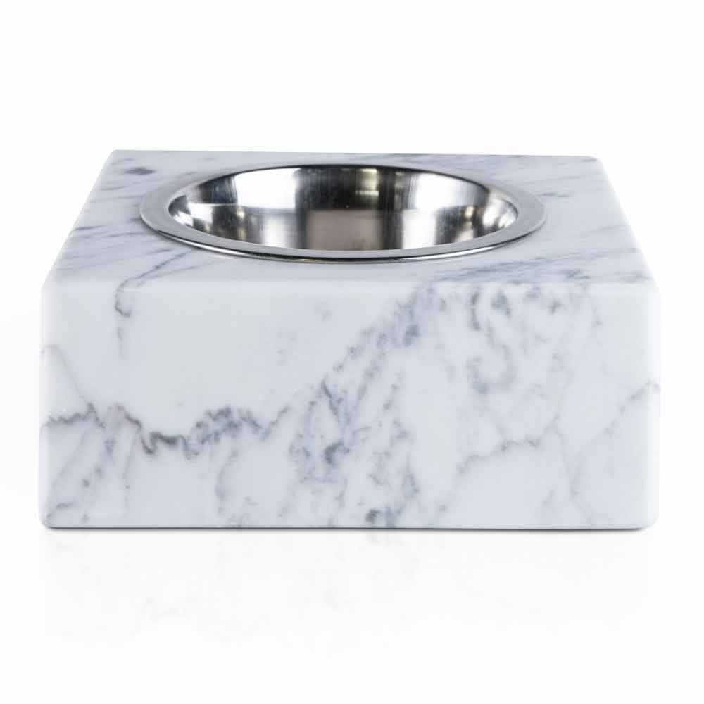 Voerbak voor honden en katten gekenmerkt door het witte Carrara-marmer waaruit het is samengesteld. Het is een uniek stuk omdat elk blok marmer dat wordt gebruikt, verschilt van de andere wat betreft aders en tinten.