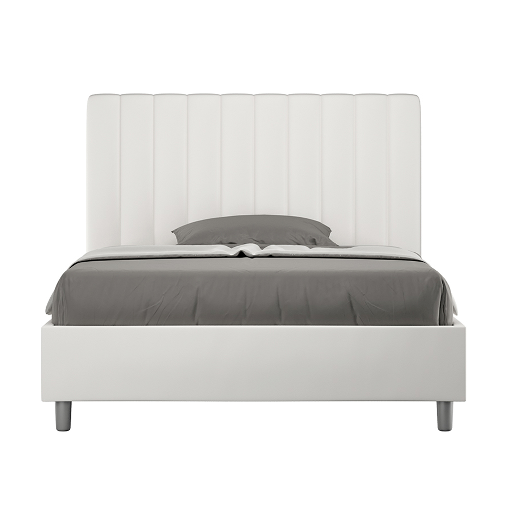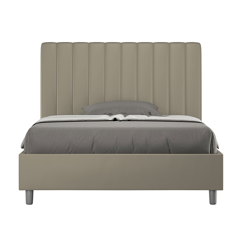 Frans bed van 140x200 cm, gewatteerd, gemaakt van melamine panelen en bekleed met kunstleer , volledig vervaardigd in Italië. Dit Franse bed met gestoffeerd bedframe is ideaal voor wie op zoek is naar een opvallend meubelstuk zonder te overheersend te zijn. Het bed heeft een minimalistisch hoofdbord met een subtiel doorgestikt effect van symmetrische verticale lijnen , dat prachtig past in elke inrichting, zowel modern als klassiek. De kunstleren bekleding geeft de kamer een warme en uitnodigende uitstraling.
