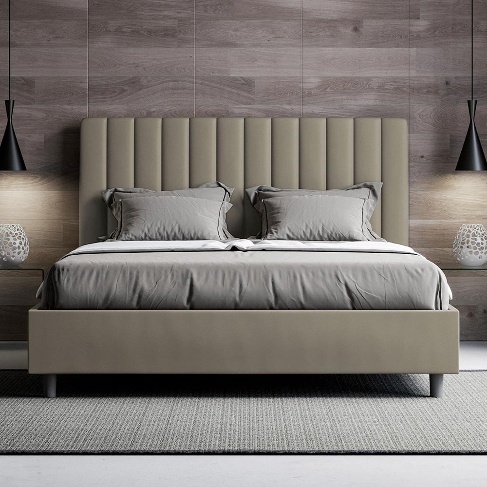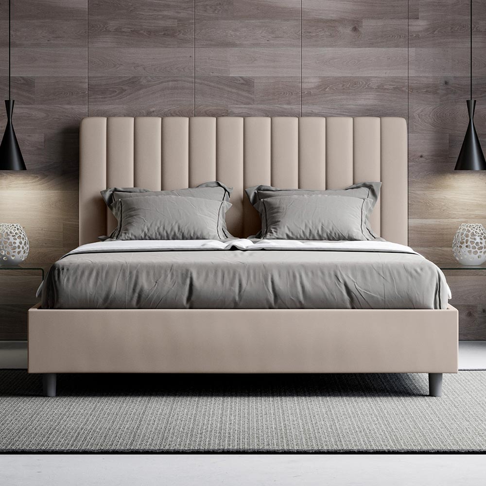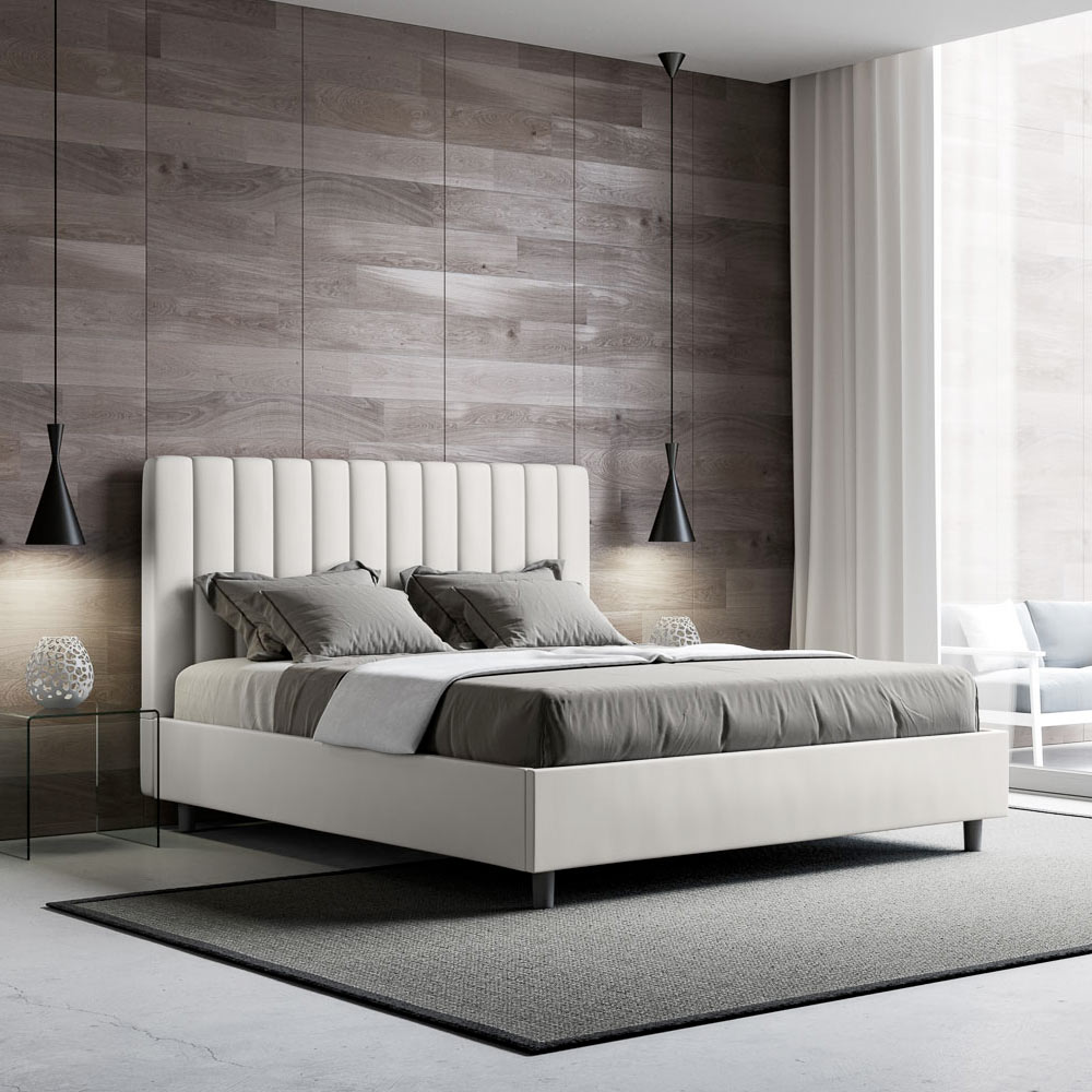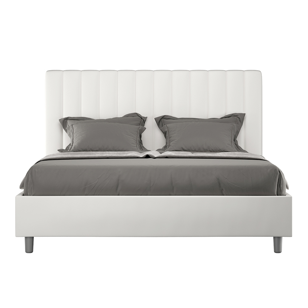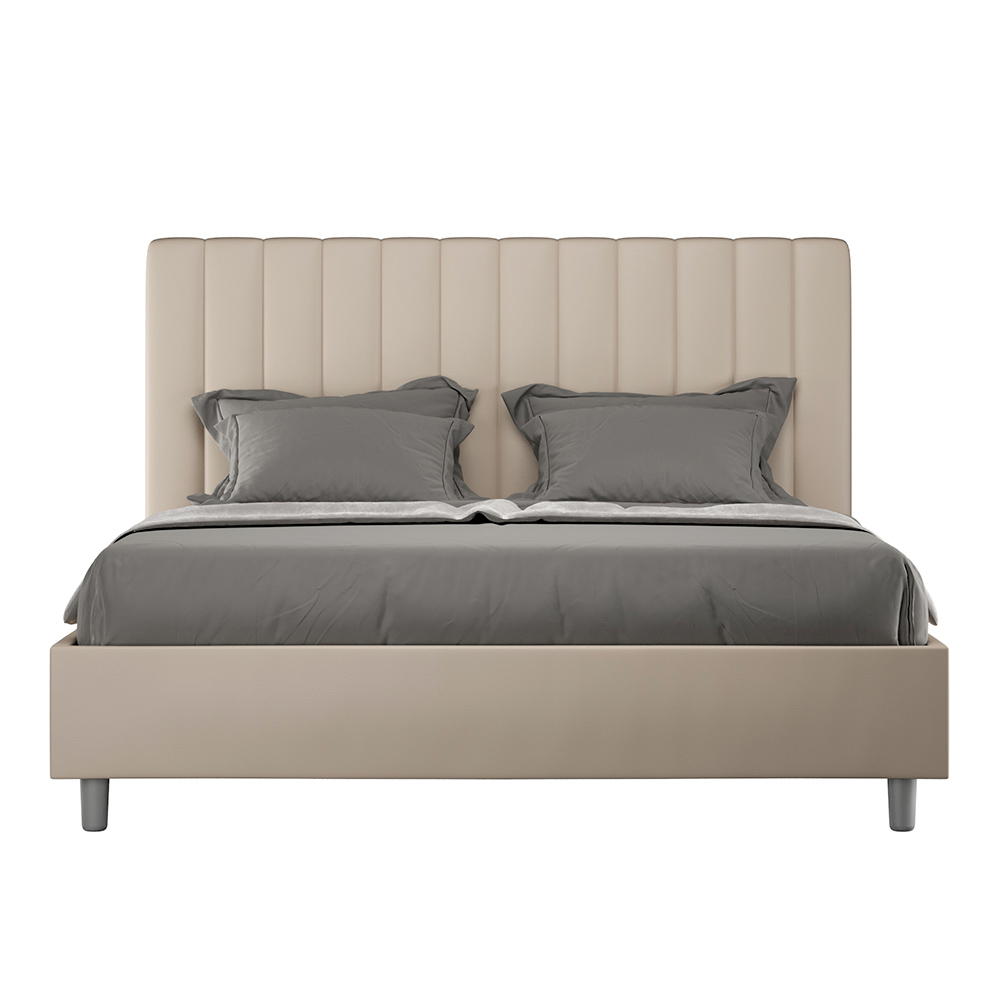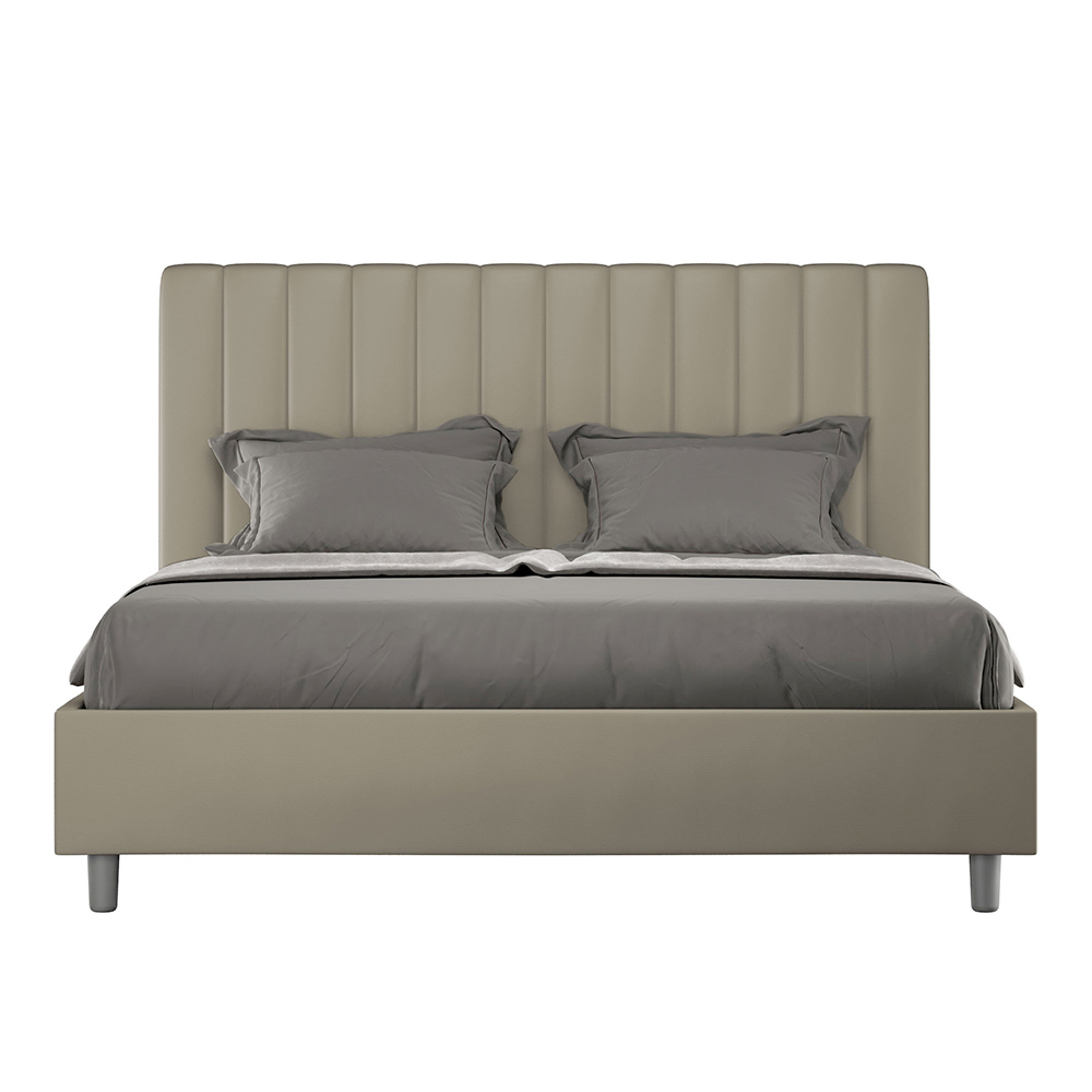 Gewatteerd tweepersoonsbed van 160x200 cm, gemaakt van spaanplaat en bekleed met kunstleer , volledig Made in Italy. Dit tweepersoonsbed met gestoffeerd frame is ideaal voor wie op zoek is naar een opvallend meubelstuk zonder te overheersend te zijn. Het bed heeft een minimalistisch hoofdbord met een subtiel doorgestikt effect van symmetrische verticale lijnen , dat prachtig past in elke omgeving, zowel modern als klassiek. De kunstleren bekleding geeft de kamer een warme en uitnodigende uitstraling. Het bed is bijzonder geschikt voor lichte ruimtes, omdat de stof zijn kleur behoudt, zelfs na langdurige blootstelling aan zonlicht.