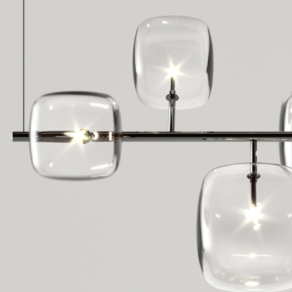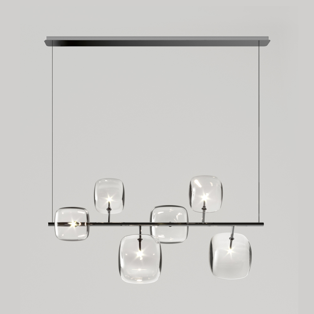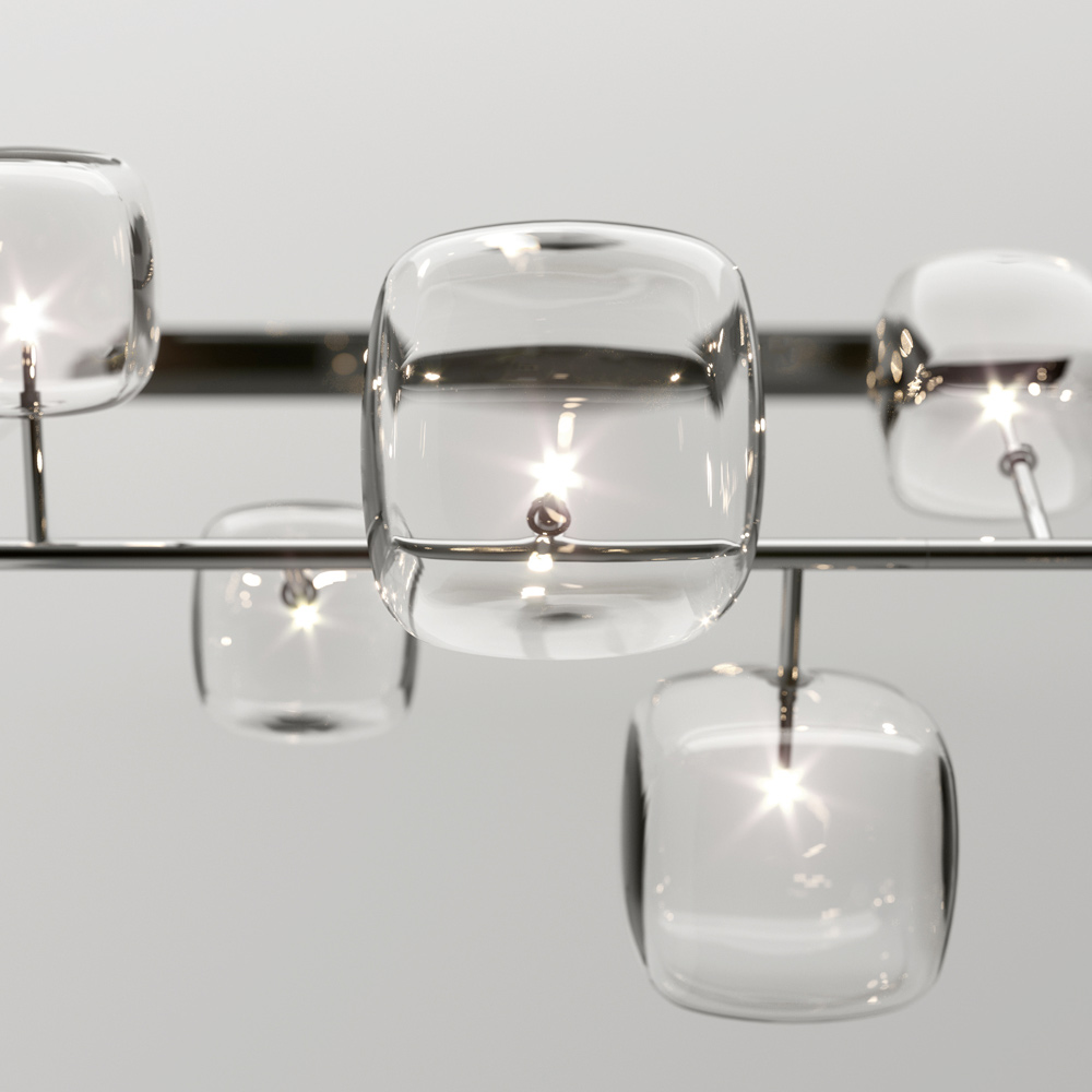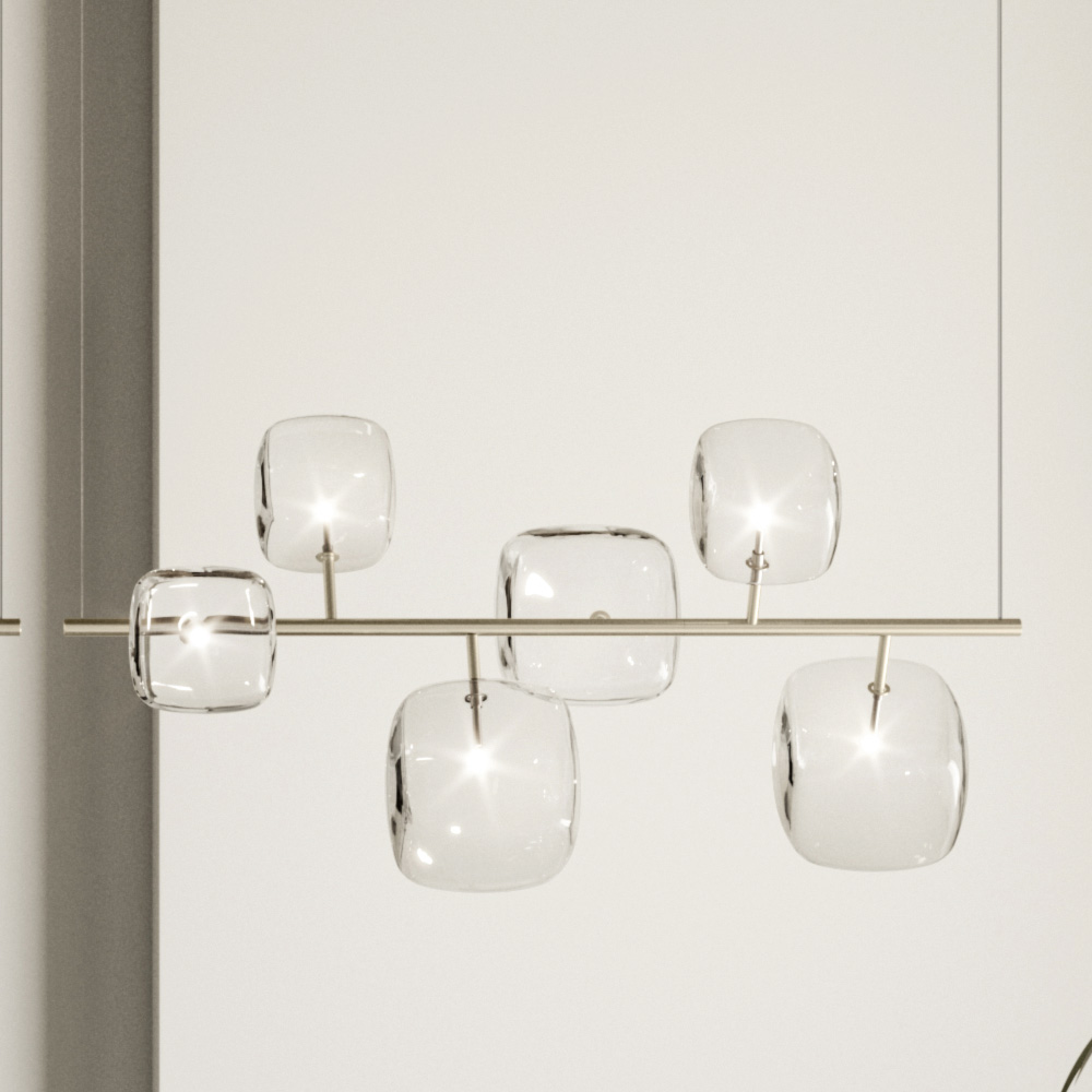 Horizontale hanglamp met metalen structuur en 6 kubusvormige en ronde structuren in transparant geblazen Pyrex-glas met elk 1 dimbare G4 3000K LED-lamp .