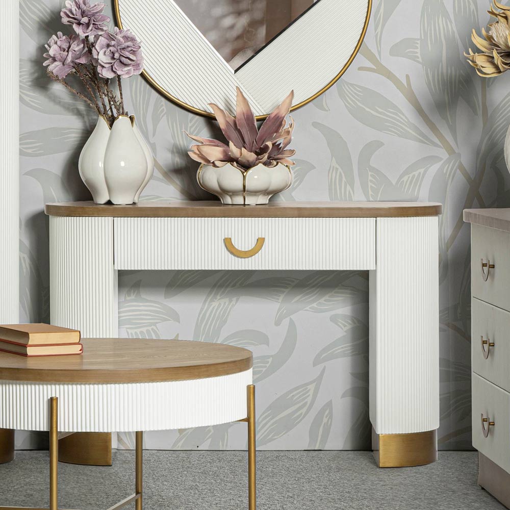 Door zijn veelzijdige uiterlijk is het de perfecte keuze om een hal, hal of als kaptafel in een slaapkamer te verrijken. De console getuigt van het vermogen van een goed ontwerp om zich aan te passen aan verschillende omgevingen en deze te verbeteren, waardoor dit meubelstuk een centraal element wordt voor degenen die meubels willen die spreken van verfijning en bruikbaarheid .