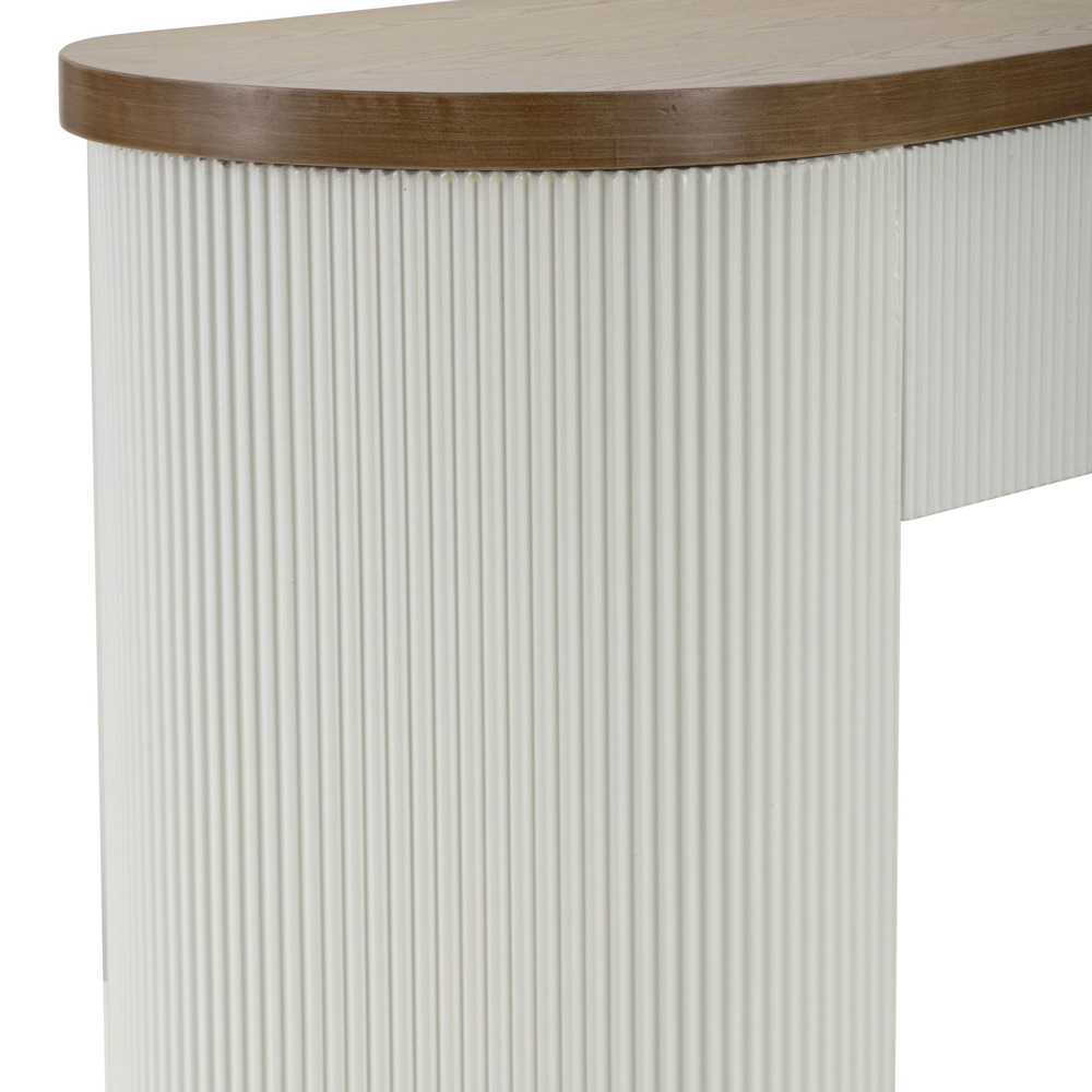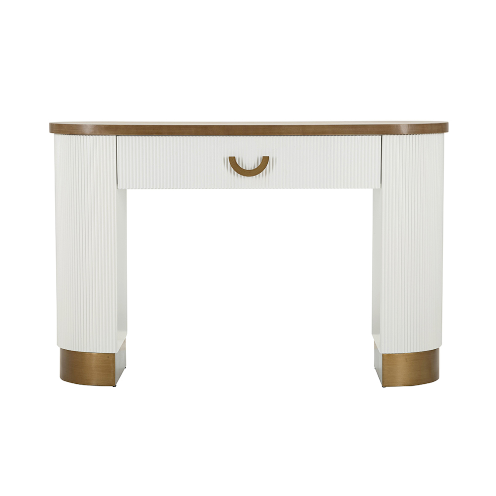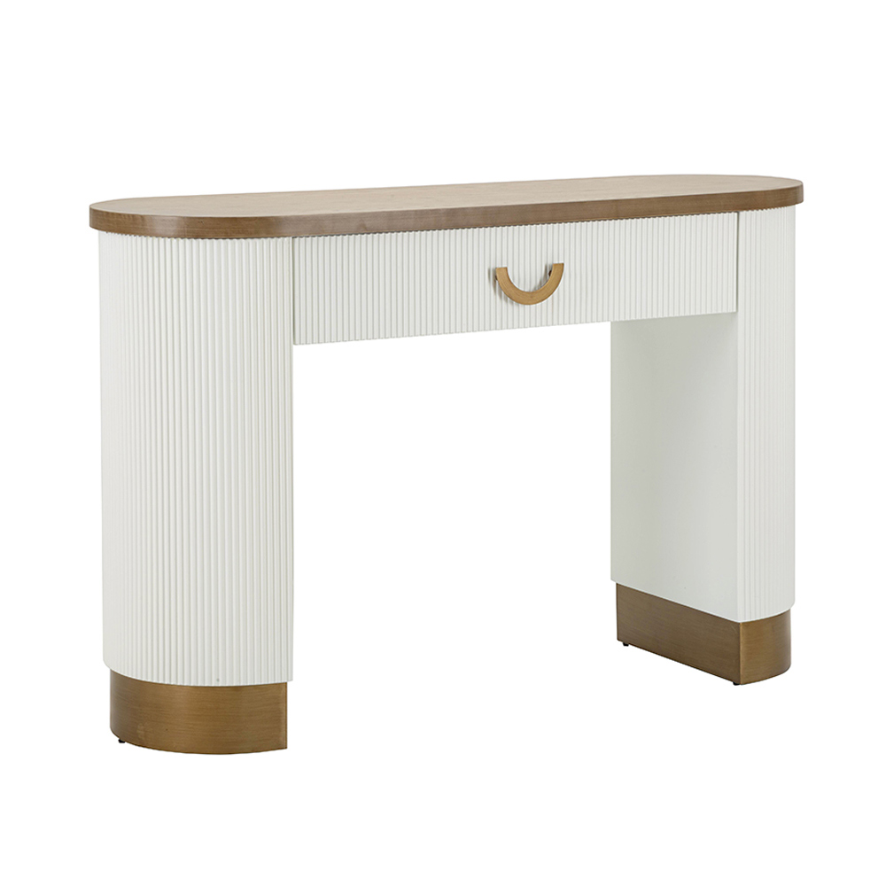 Deze halfronde console vertegenwoordigt een betoverende mix van eigentijds design en klassieke details. De elegante structuur, met zijn strakke lijnen en warm getinte MDF-oppervlakken, contrasteert harmonieus met de zachtheid van de verticale groeven die de zijpanelen sieren, wat een rijke visuele ervaring en een boeiende textuur biedt.