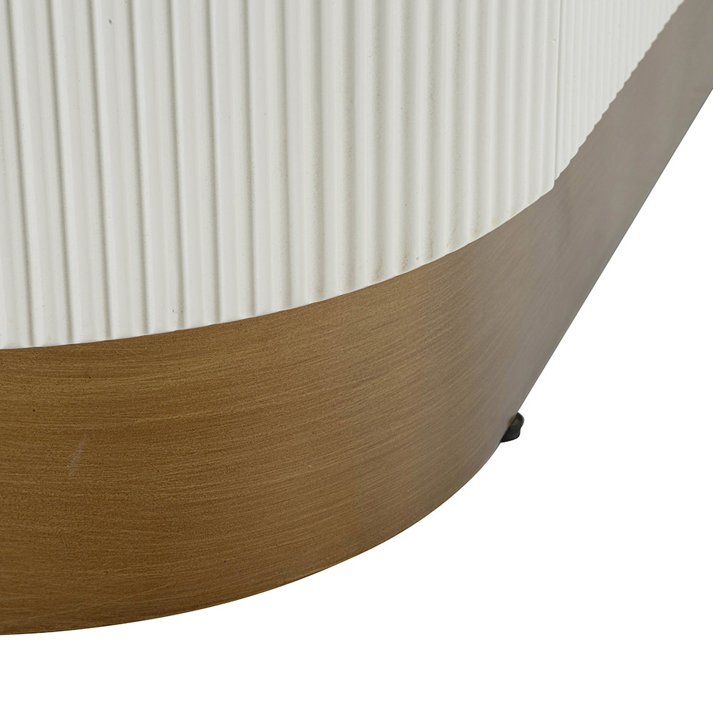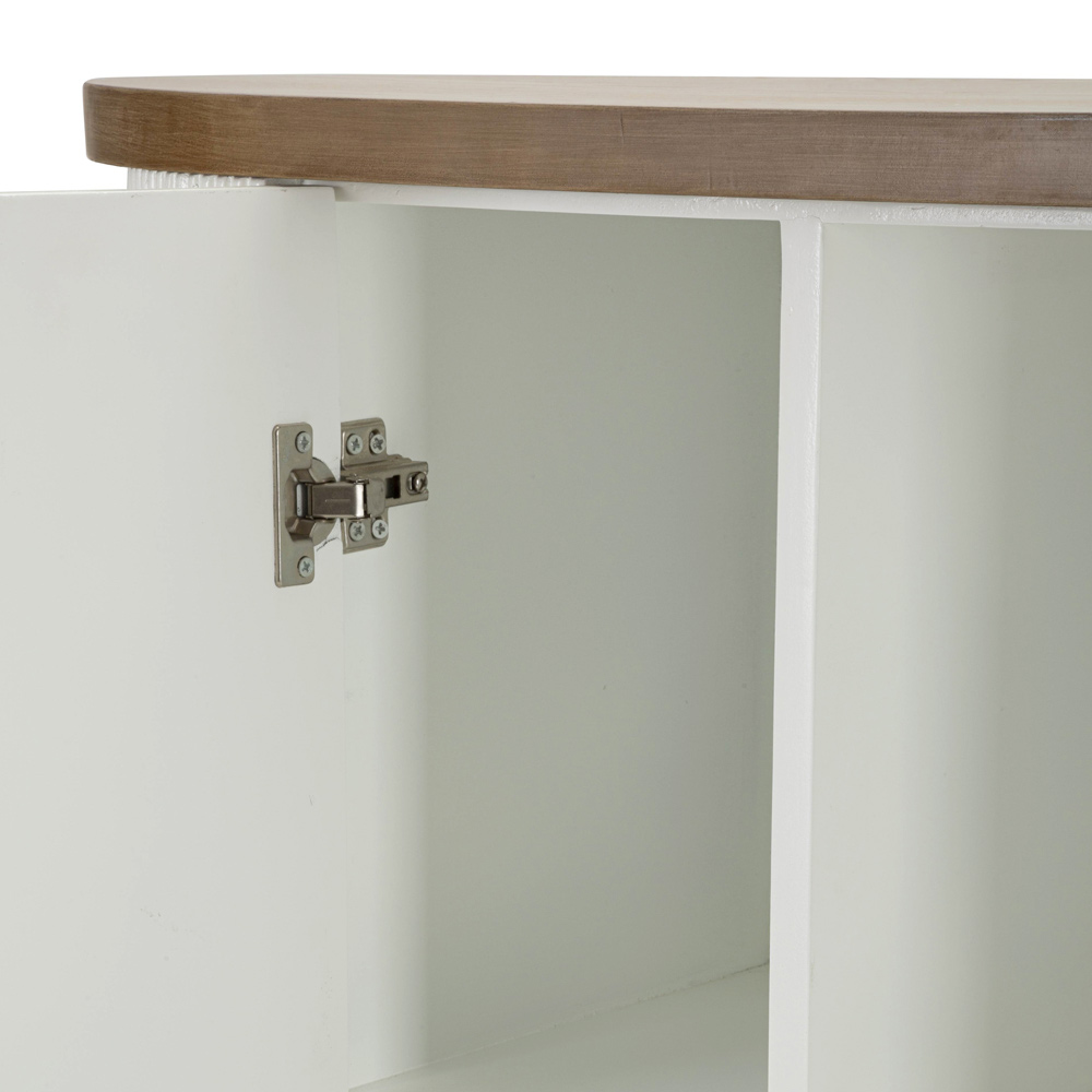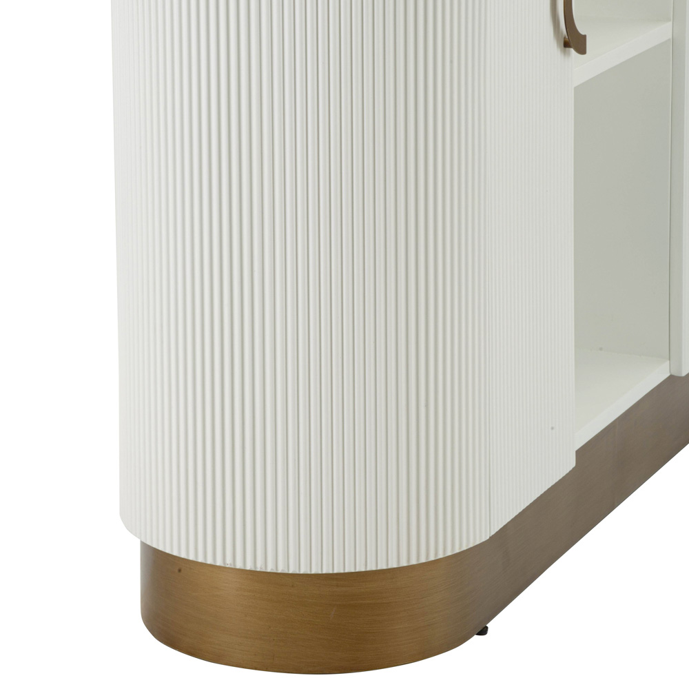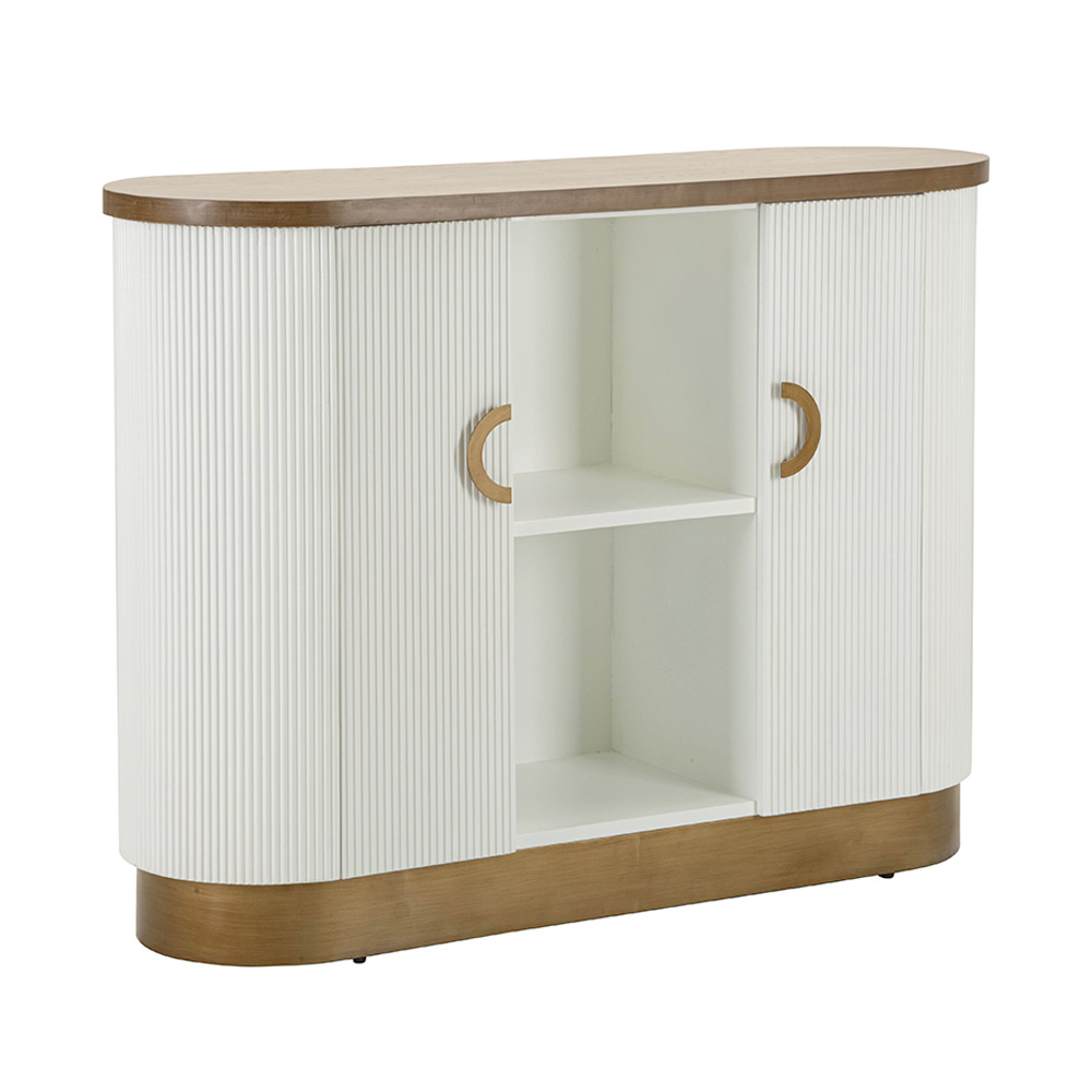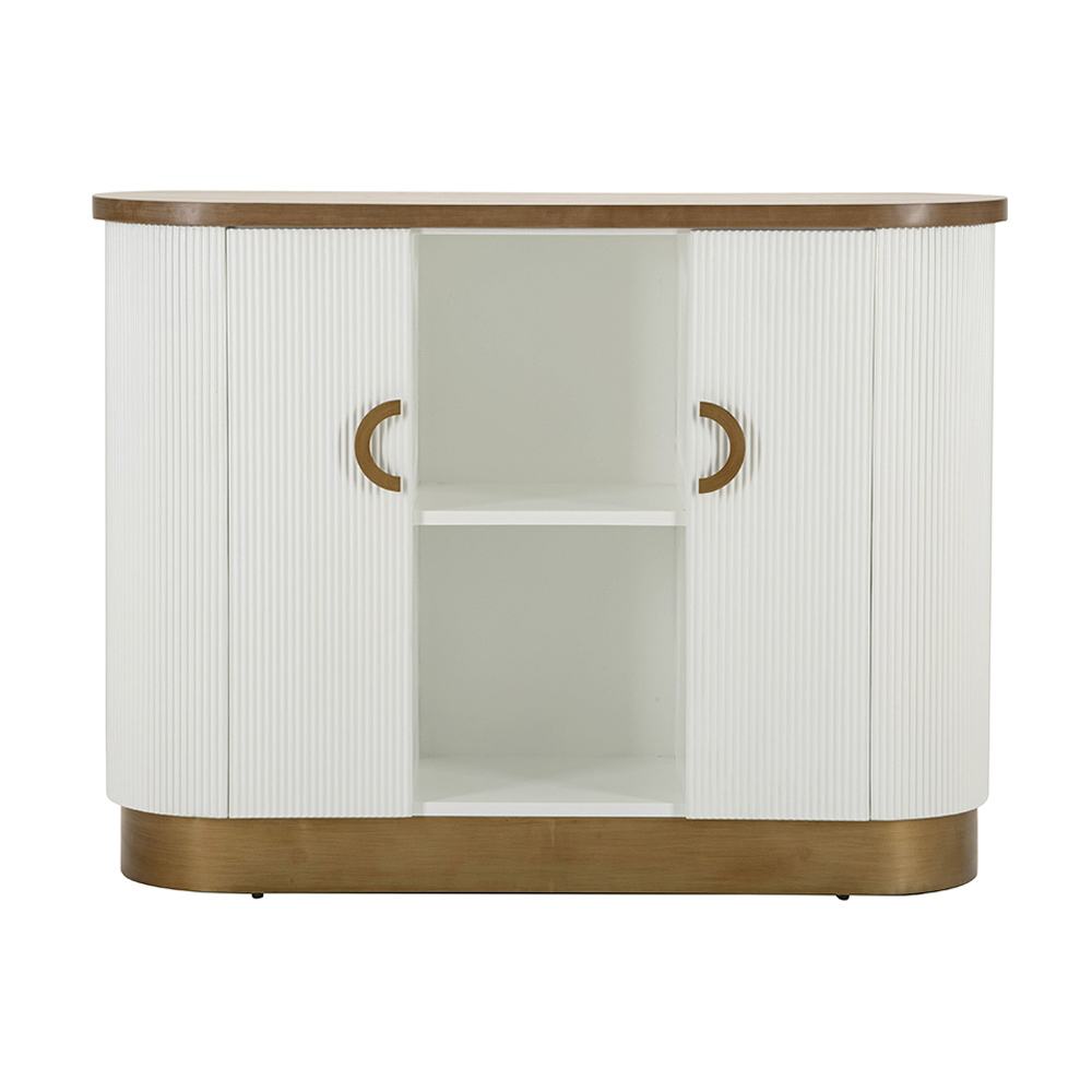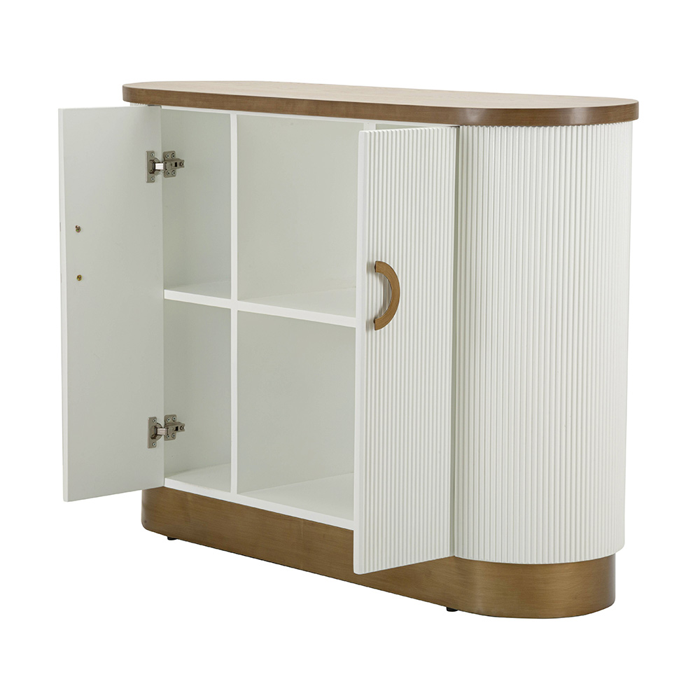 Dit kromlijnige meubelstuk belichaamt de perfecte ontmoeting tussen functionaliteit en verfijnde stijl . Het zachte silhouet en de afgeronde hoeken van de kast worden geaccentueerd door de warme afwerking die de witte gecanneleerde deuren omlijst. Het verticale geribbelde effect voegt niet alleen textuur en visuele diepte toe, maar roept ook een gevoel van hernieuwde klassieke elegantie op.