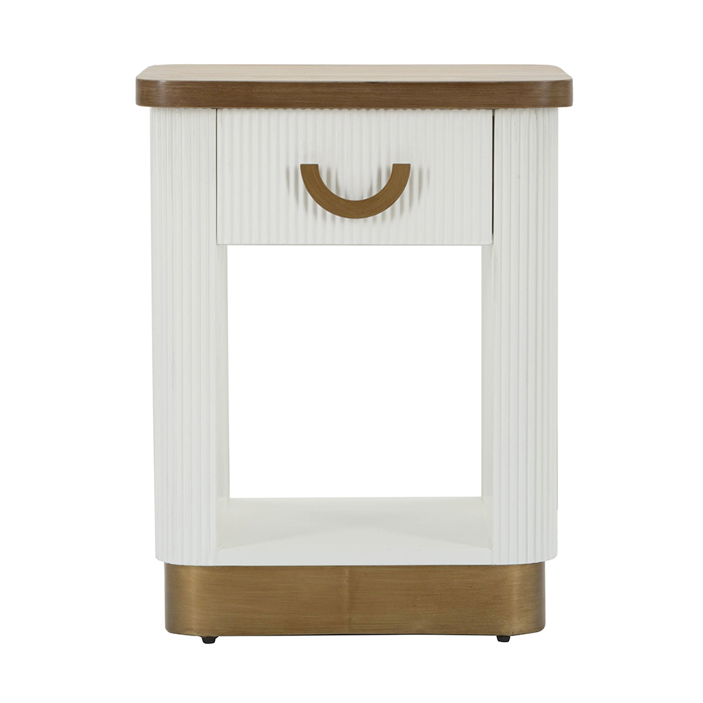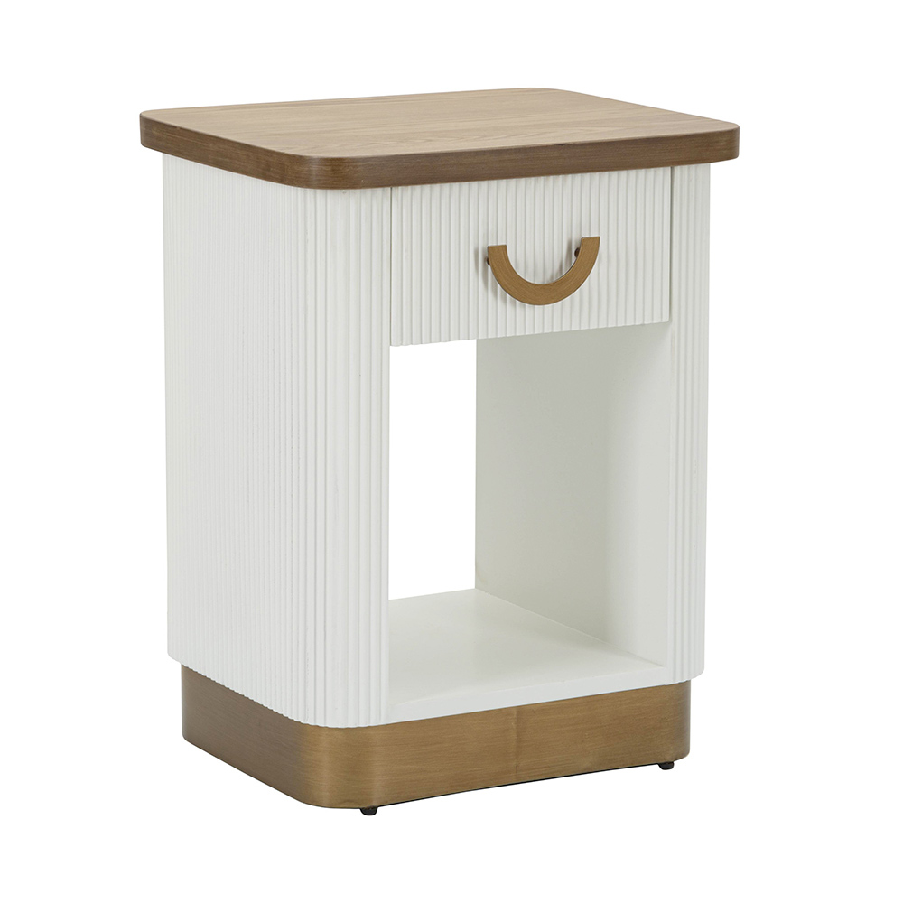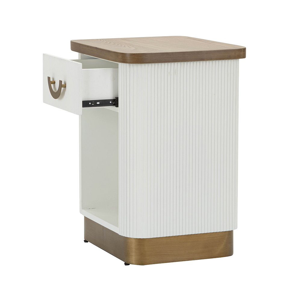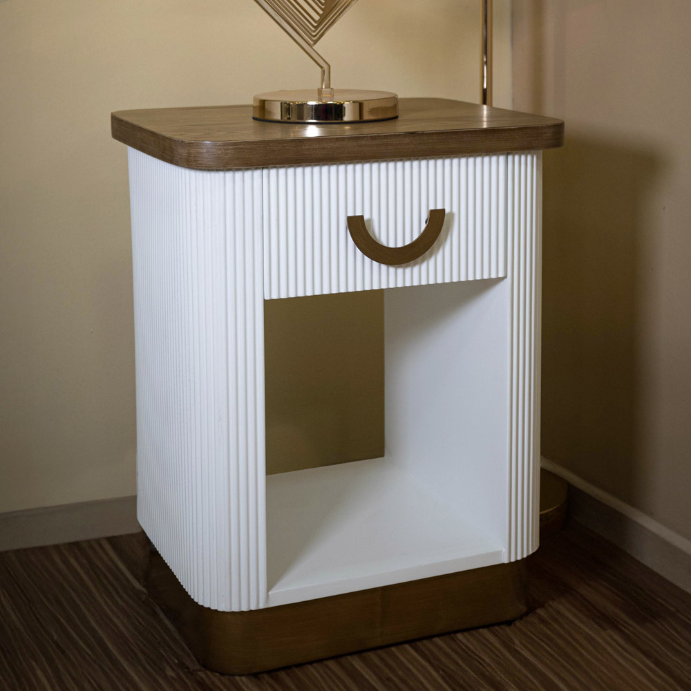 De gecanneleerde witte basis van het nachtkastje is een statement van moderne elegantie , met zijn strakke lijnen en verticale textuur die diepte en visuele interesse toevoegen. Het detail van het handvat past perfect bij de basis, wat een vintage en toch eigentijdse uitstraling geeft.